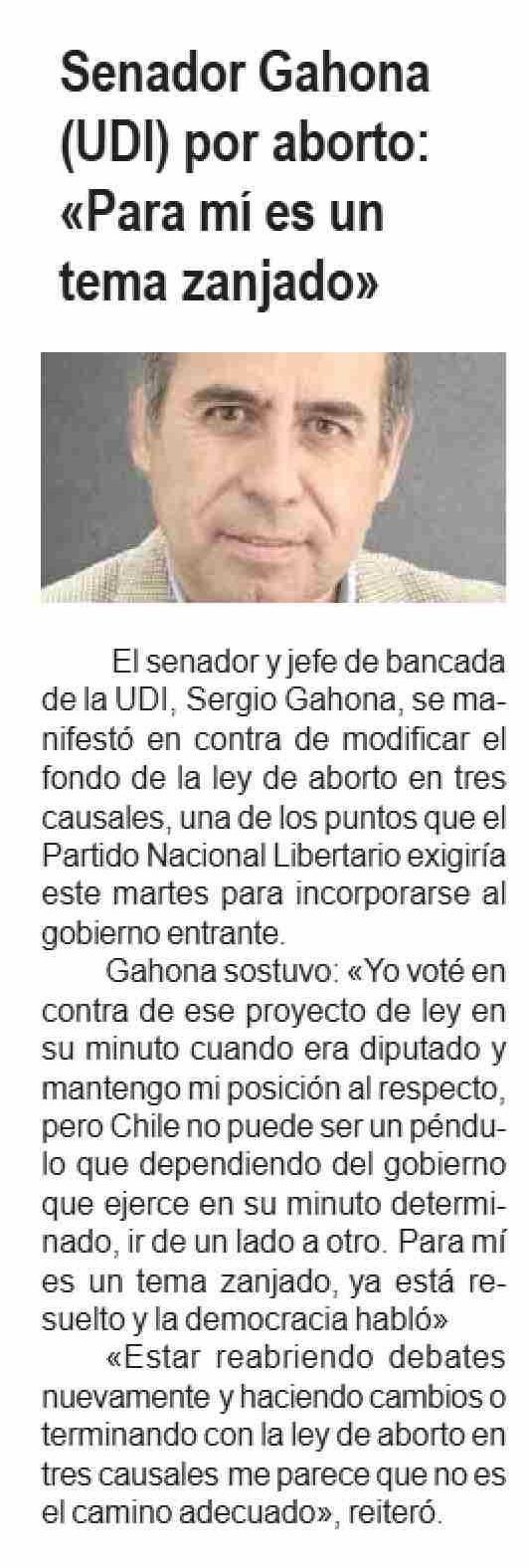 Senador Gahona (UDI) por aborto: «Para mí es un tema zanjado»