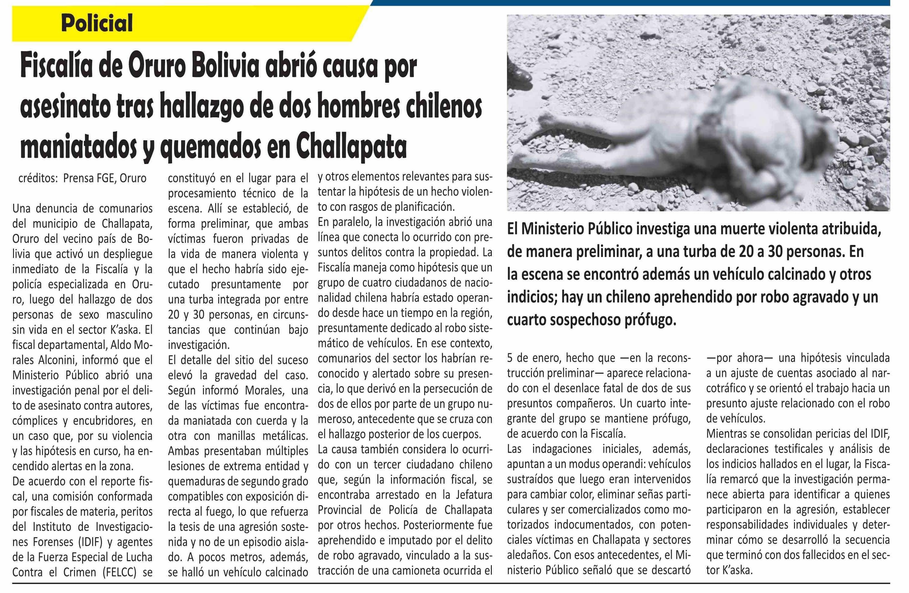 Fiscalía de Oruro Bolivia abrió causa por asesinato tras hallazgo de dos hombres chilenos maniatados y quemados en Challapata