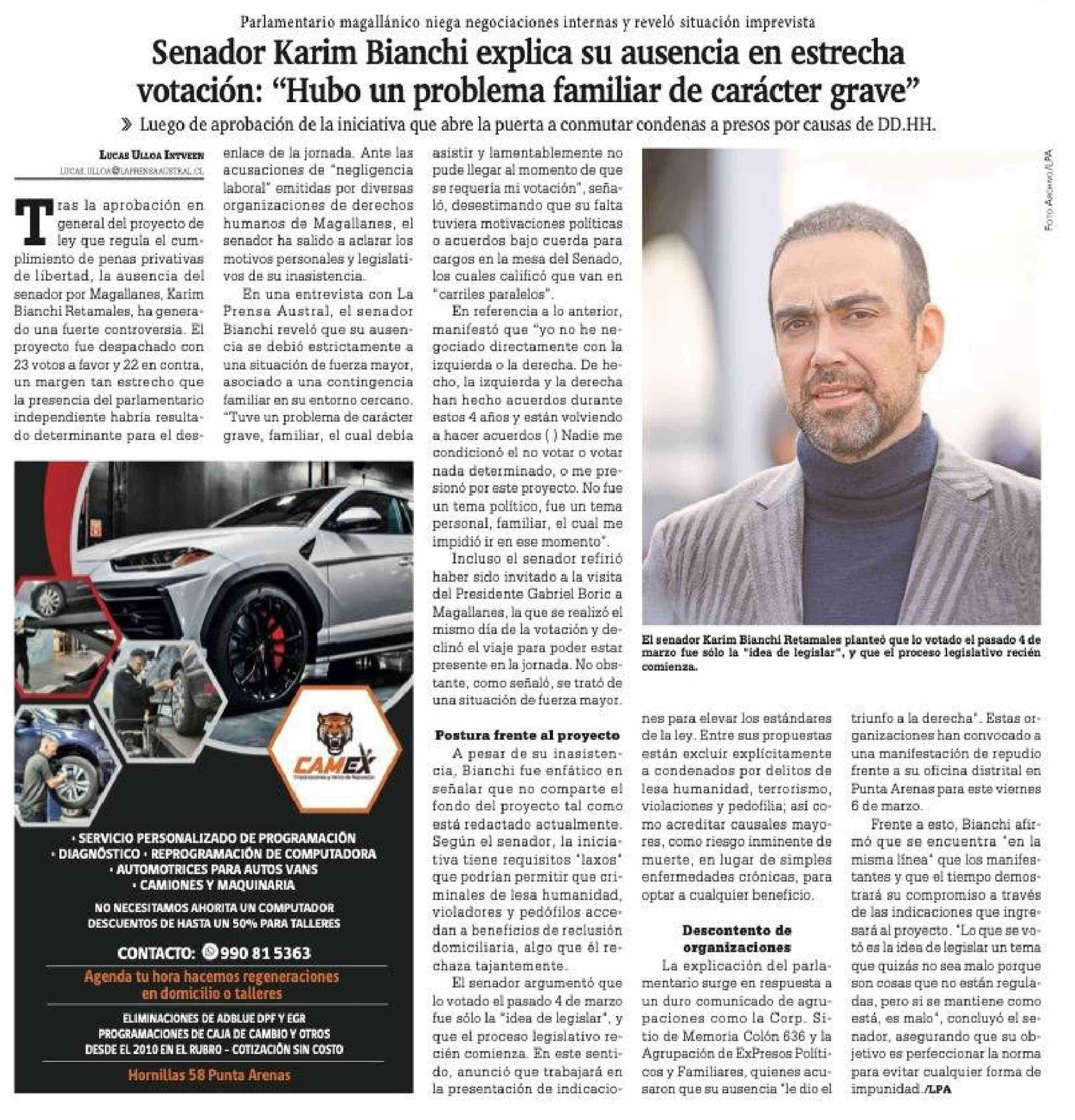Título: Senador Karim Bianchi explica su ausencia en estrecha votación: "Hubo un problema familiar de carácter grave"