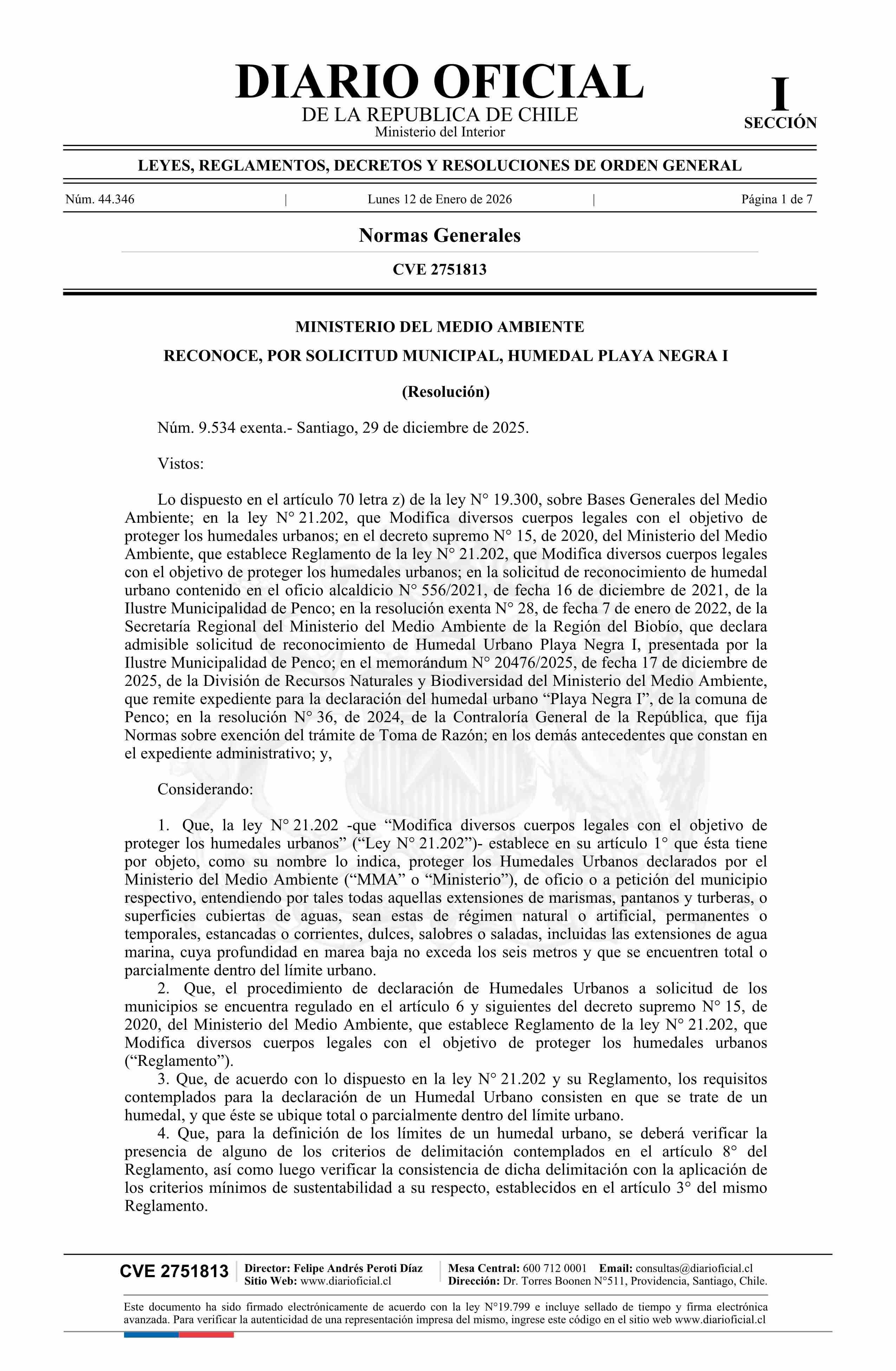 | Título: | Resolución exenta número 9.534, de 2025.- Reconoce, por solicitud municipal, Humedal Playa Negra I |
