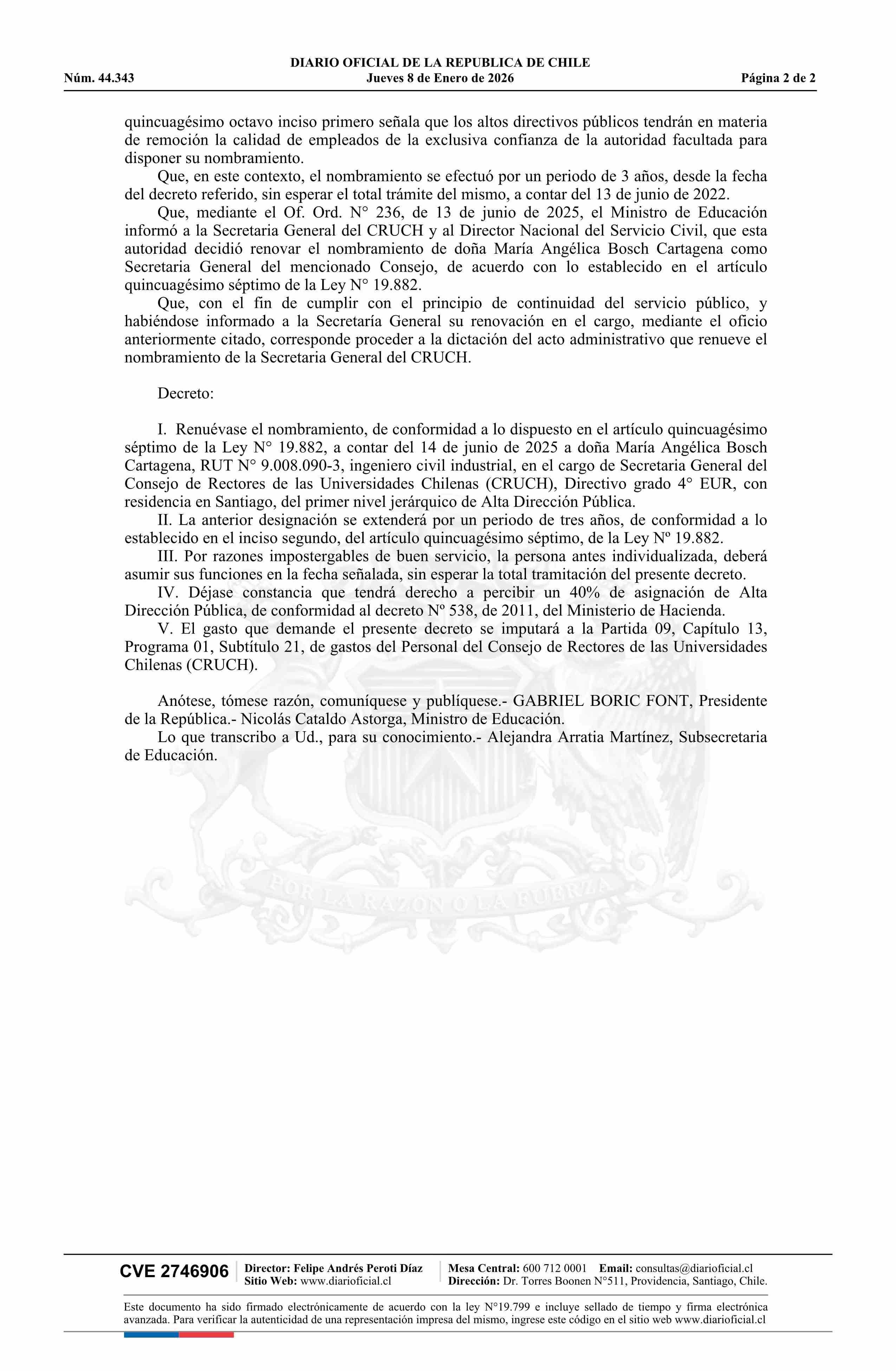 | Título: | Decreto número 89, de 2025.- Renueva designación de doña María Angélica Bosch Cartagena en el cargo de Secretaria General del Consejo de Rectores de Chile |
