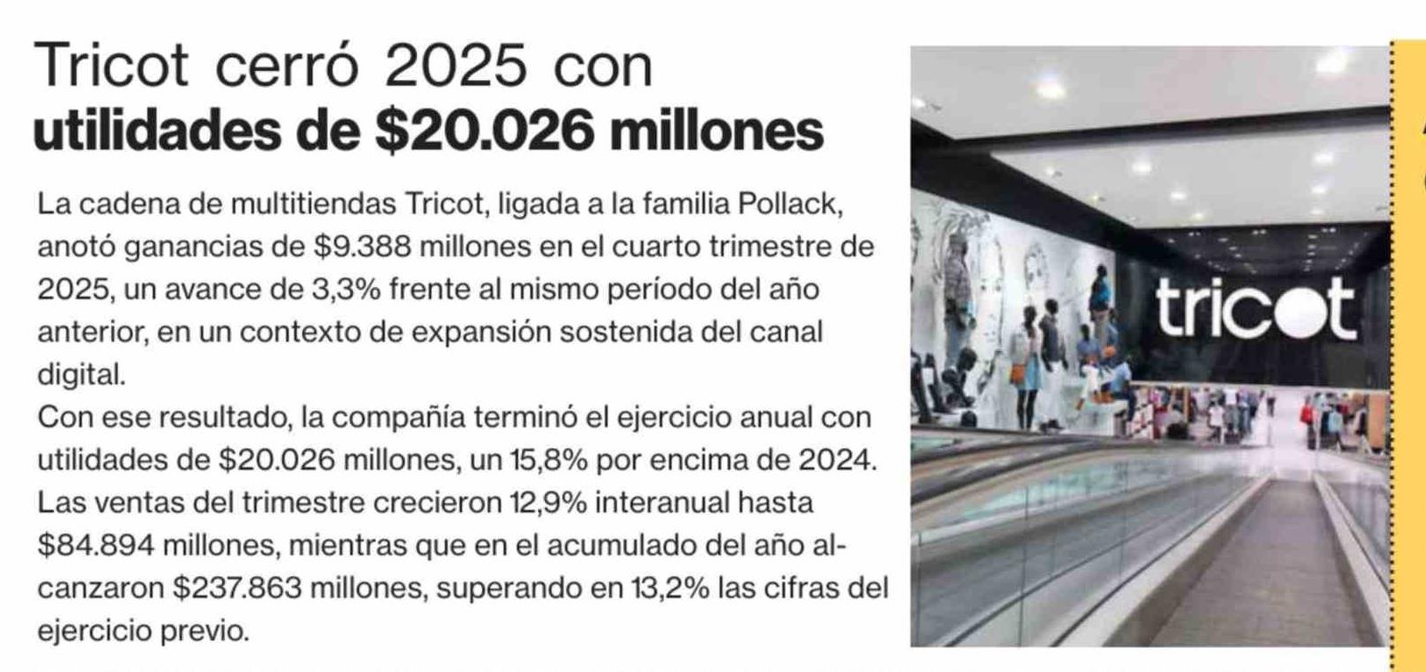 Tricot cerró 2025 con utilidades de $20.026 millones