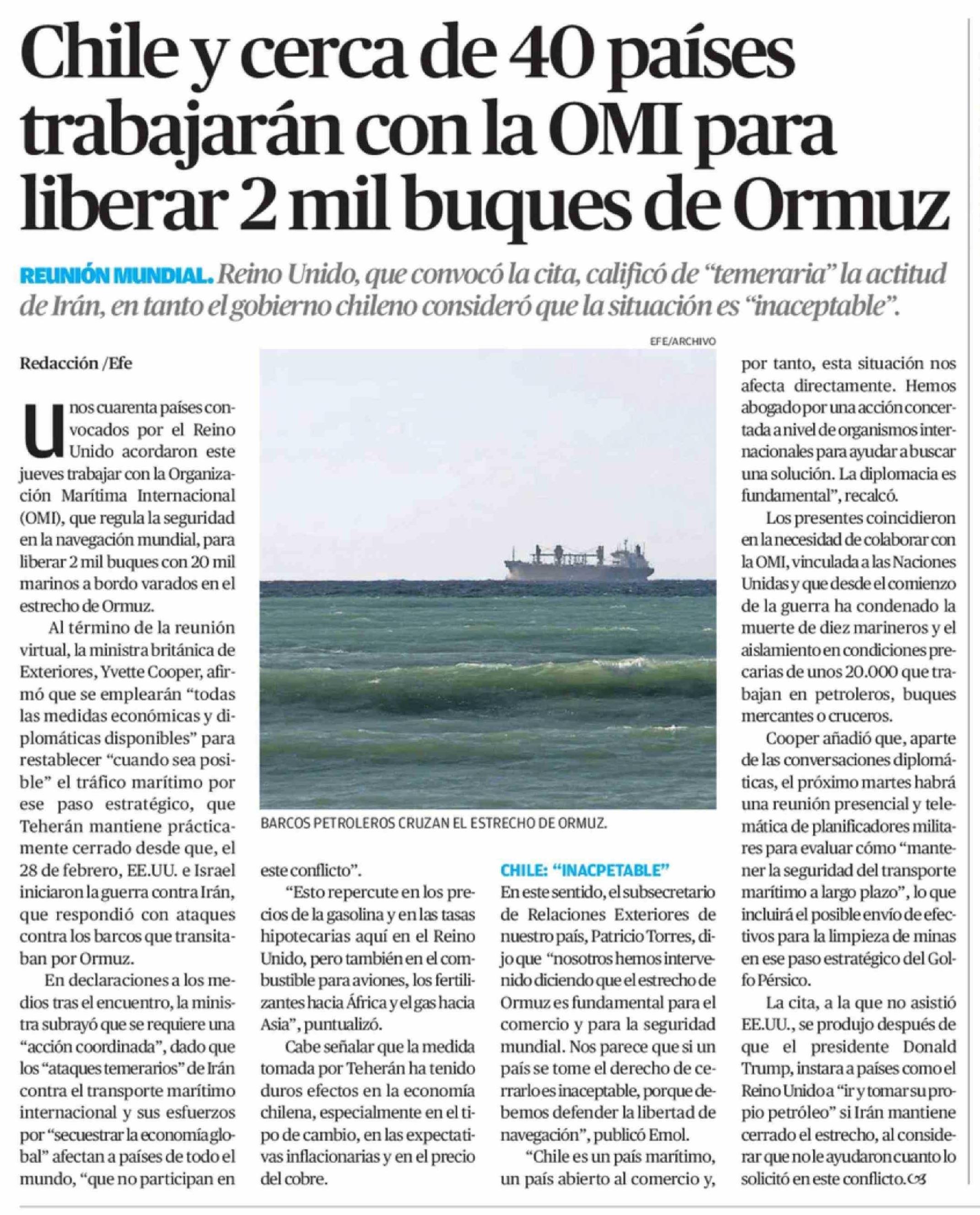 Chile y cerca de 40 países trabajarán con la OMI para liberar 2 mil buques de Ormuz