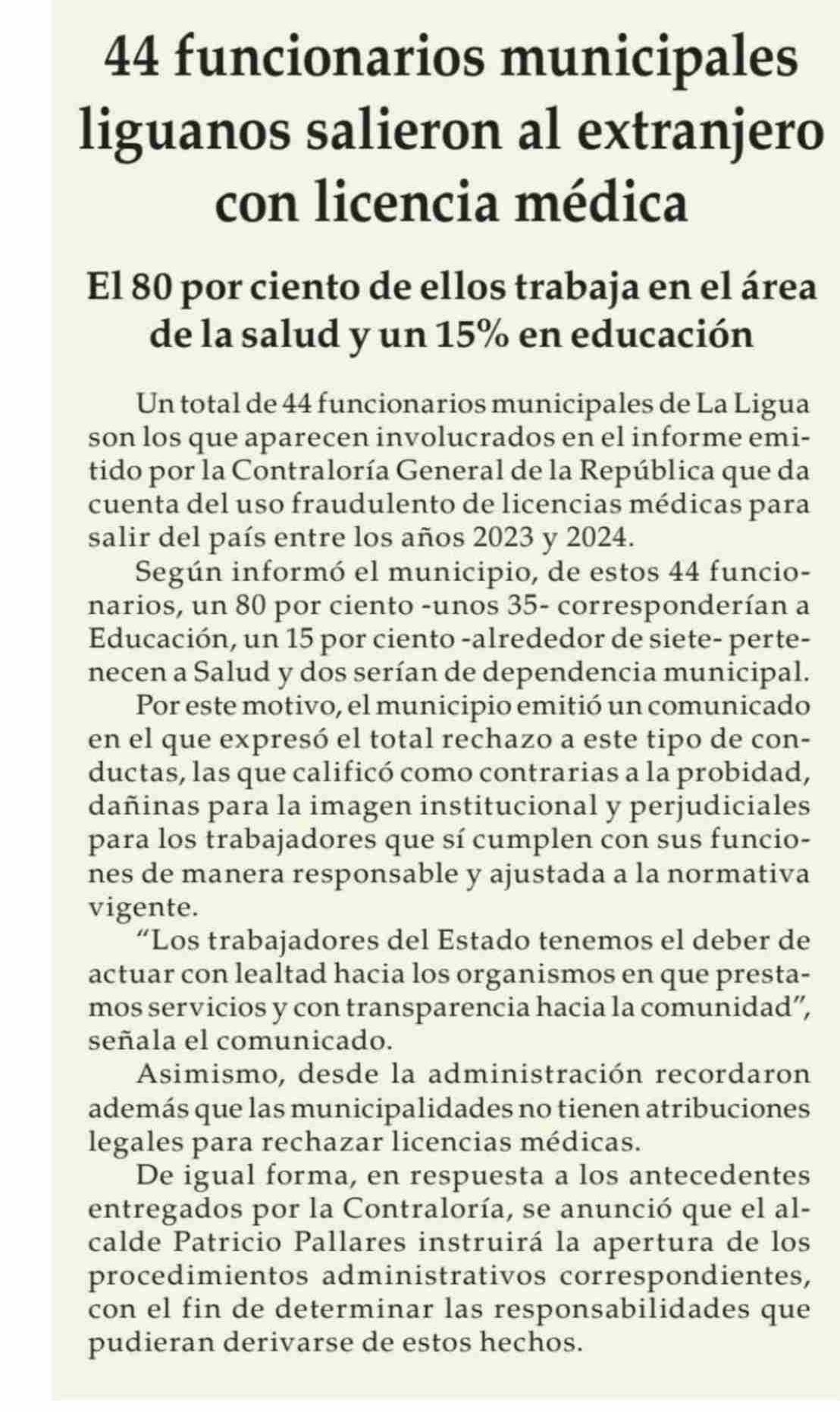 44 funcionarios municipales liguanos salieron al extranjero con licencia médica