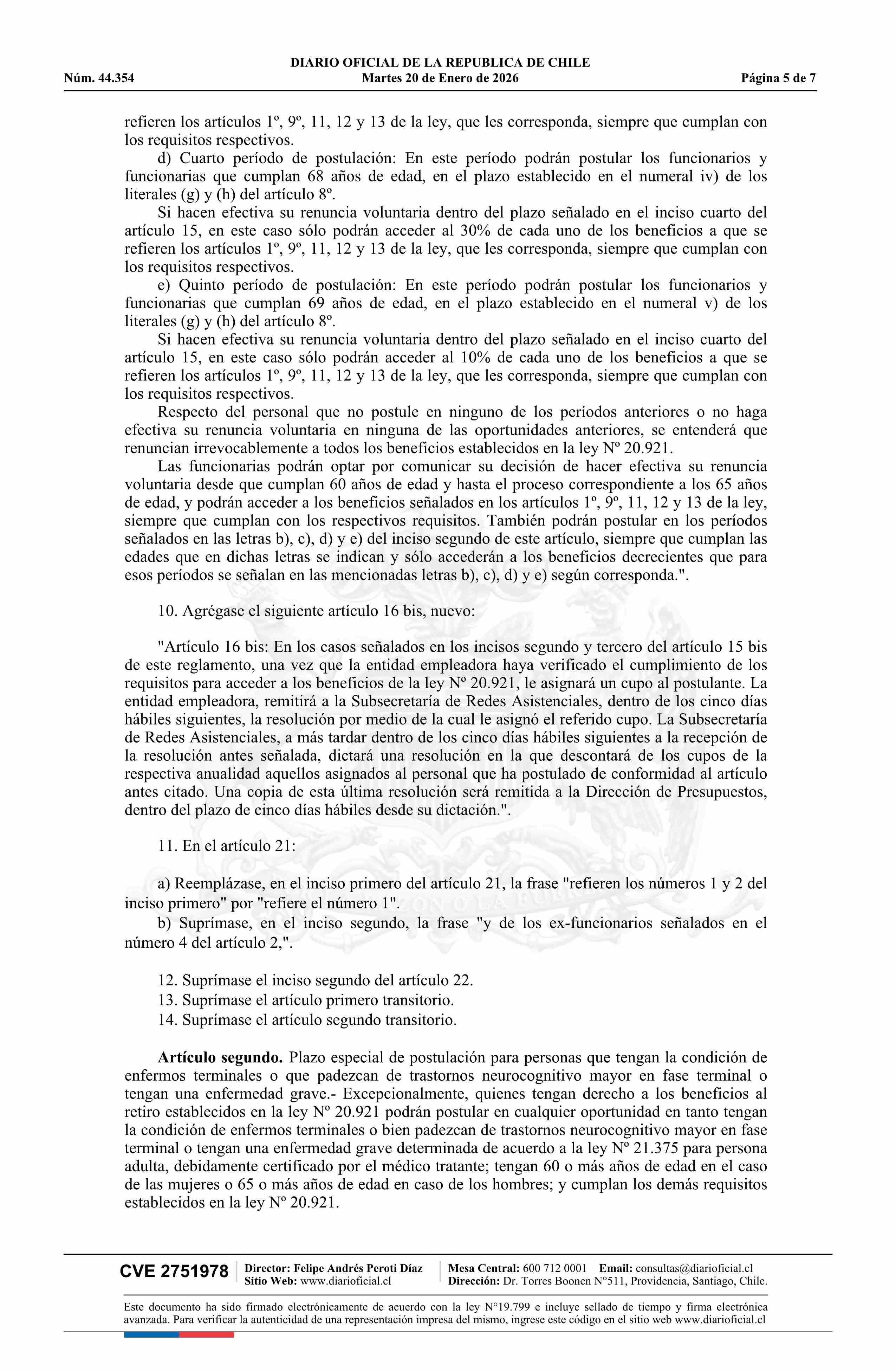 | Título: | Decreto número 17, de 2025.- Modifica decreto Nº 25, de 2016, reglamento para el otorgamiento de la bonificación por retiro voluntario establecida en la Ley Nº 20.921 |