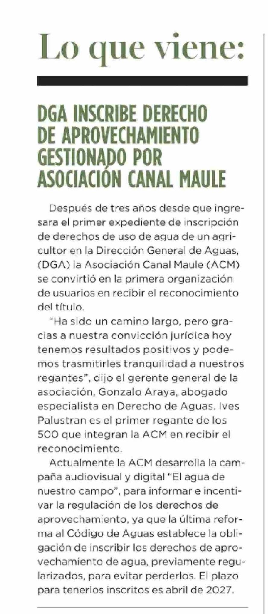 DGA INSCRIBE DERECHO DE APROVECHAMIENTO GESTIONADO POR ASOCIACION CANAL MAULE