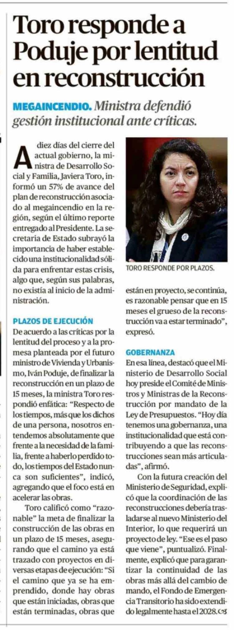 Toro responde a Poduje por lentitud en reconstrucción