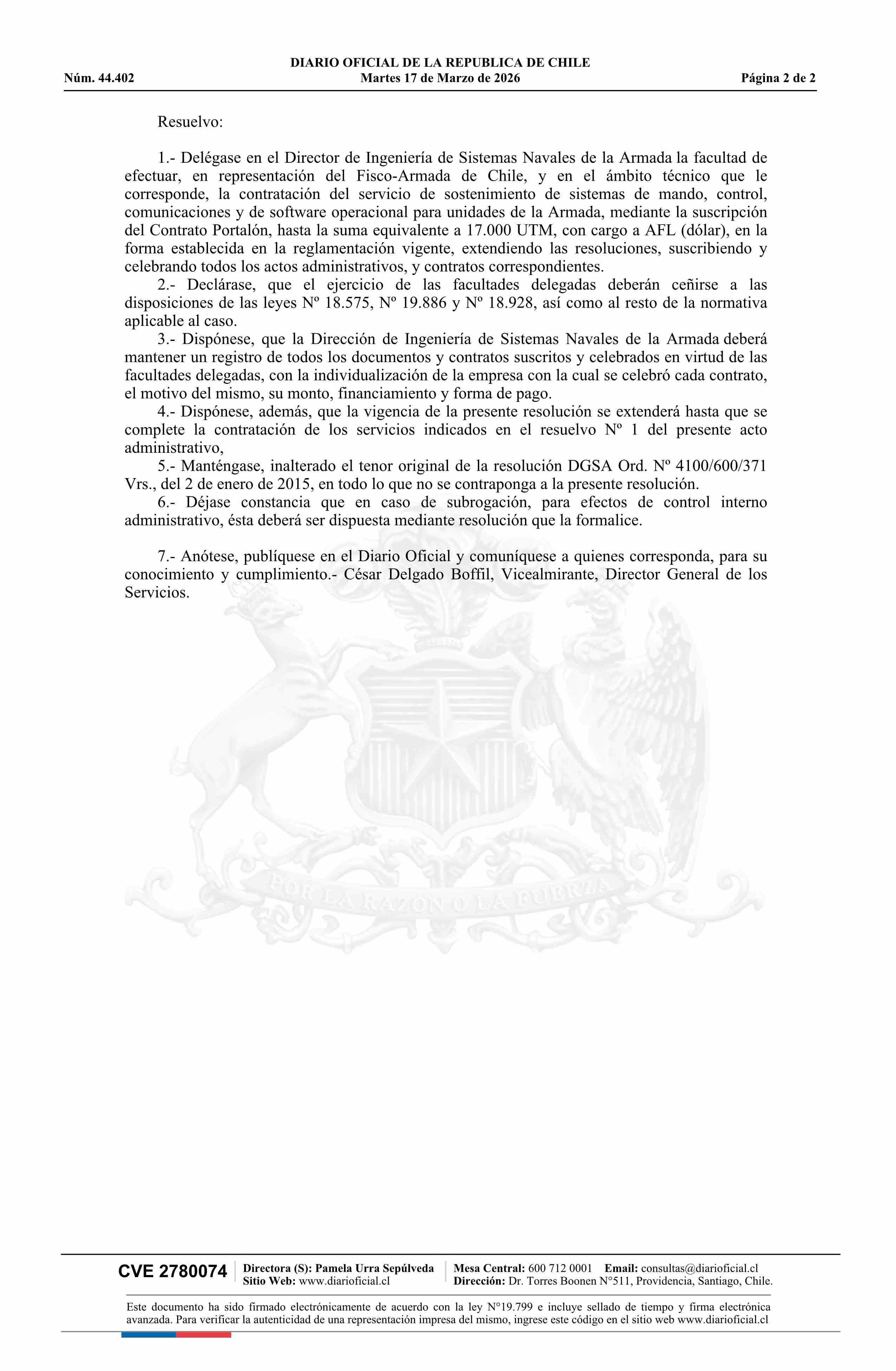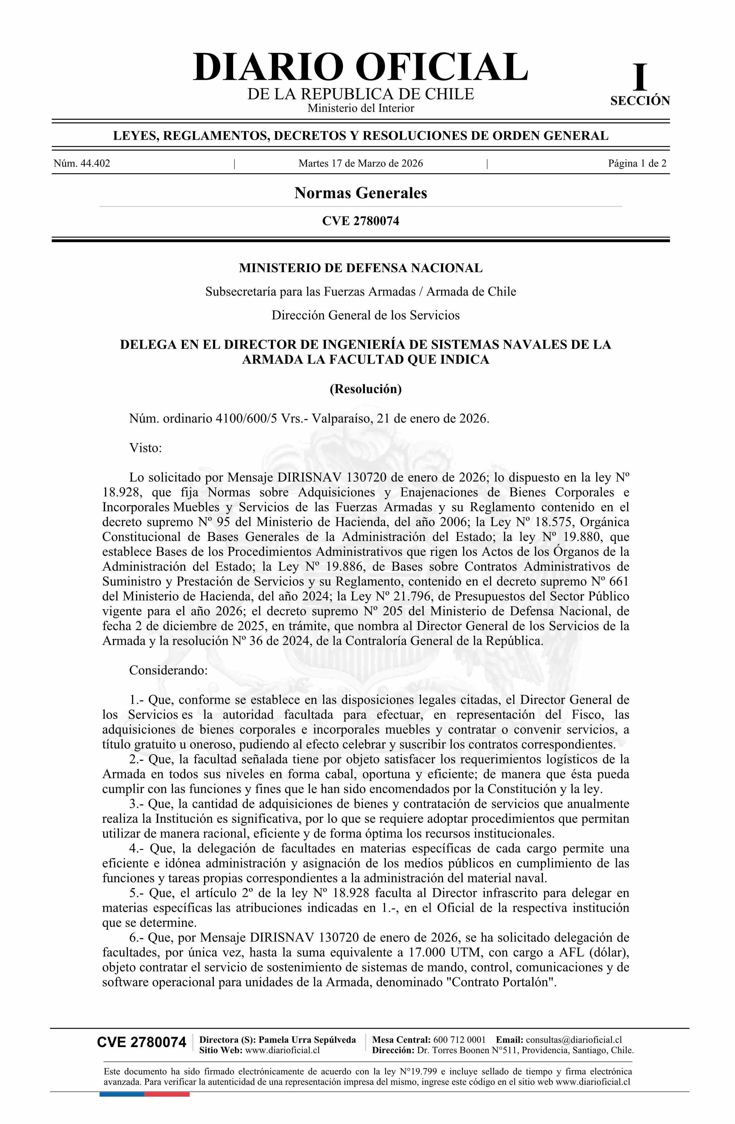 | Título: | Resolución número 4100/600/5 Vrs., de 2026.- Delega en el Director de Ingeniería de Sistemas Navales de la Armada la facultad que indica |