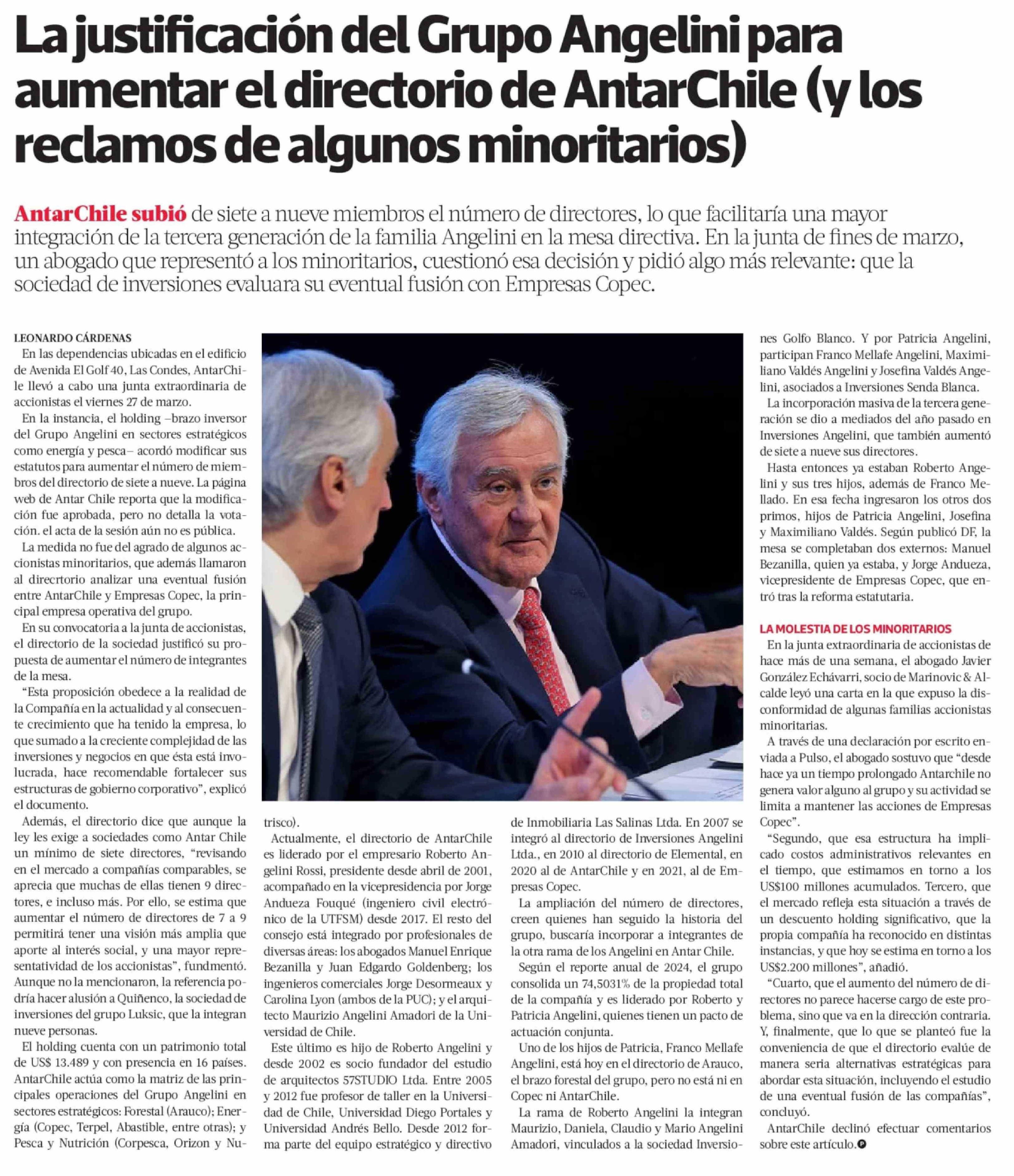 La justificación del Grupo Angelini para aumentar el directorio de AntarChile (y los reclamos de algunos minoritarios)
