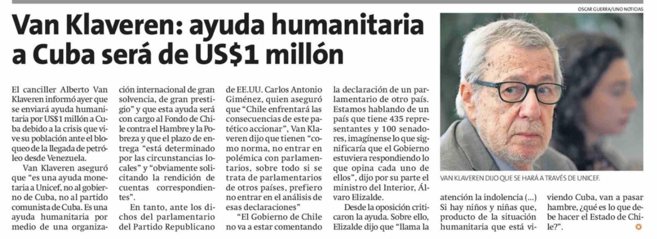 Van Klaveren: ayuda humanitaria a Cuba será de US$1 millón