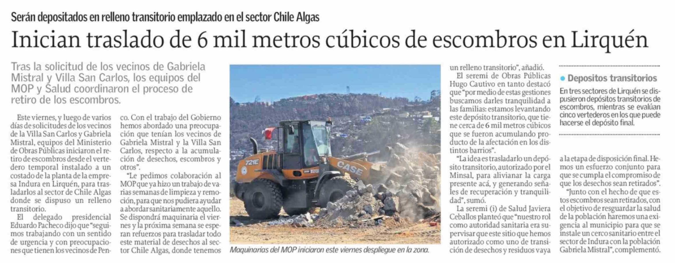 Inician traslado de 6 mil metros cúbicos de escombros en Lirquén