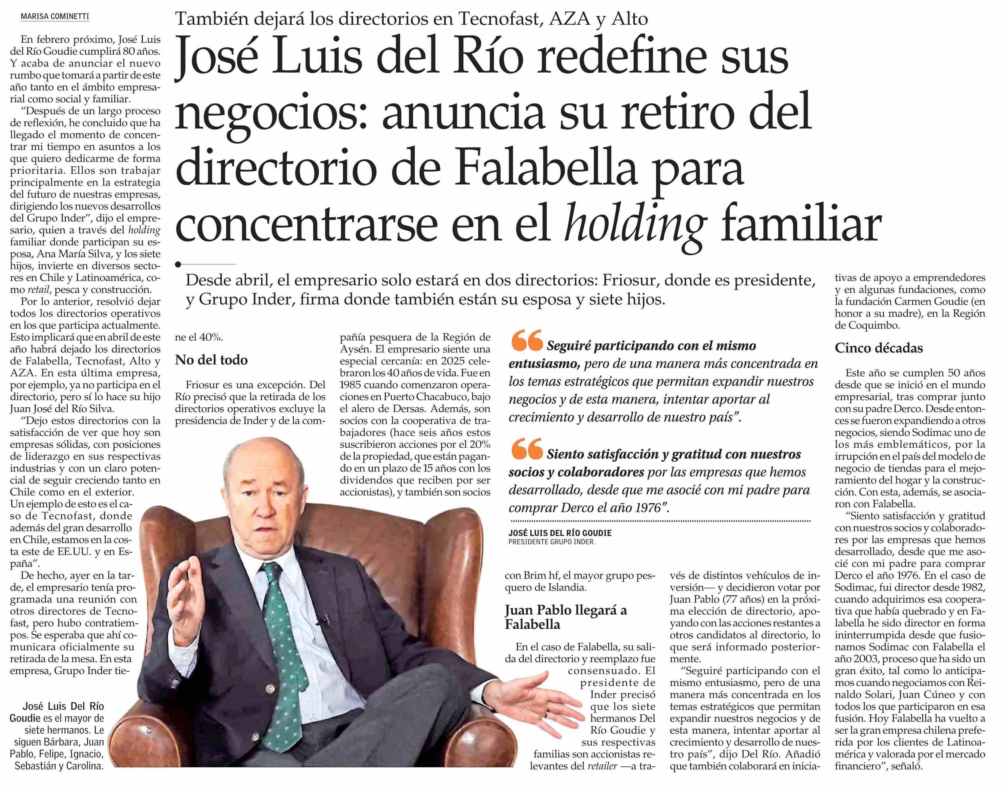 José Luis del Río redefine sus negocios: anuncia su retiro del directorio de Falabella para concentrarse en el holding familiar