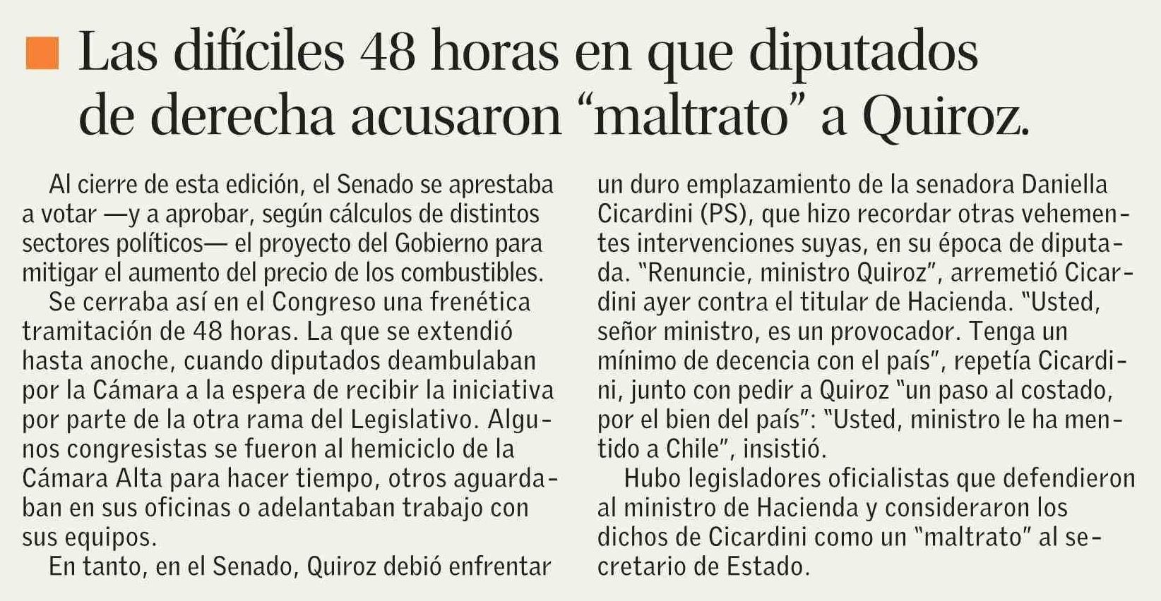 | Título: | N Las difíciles 48 horas en que diputados de derecha acusaron “maltrato” a Quiroz. un duro emplazamiento de la senadora Daniella Al cierre de esta edición, el Senado se aprestaba Cicardini (PS), que hizo recordar otras vehemena votar —y a aprobar, según cálculos de distintos tes intervenciones suyas |