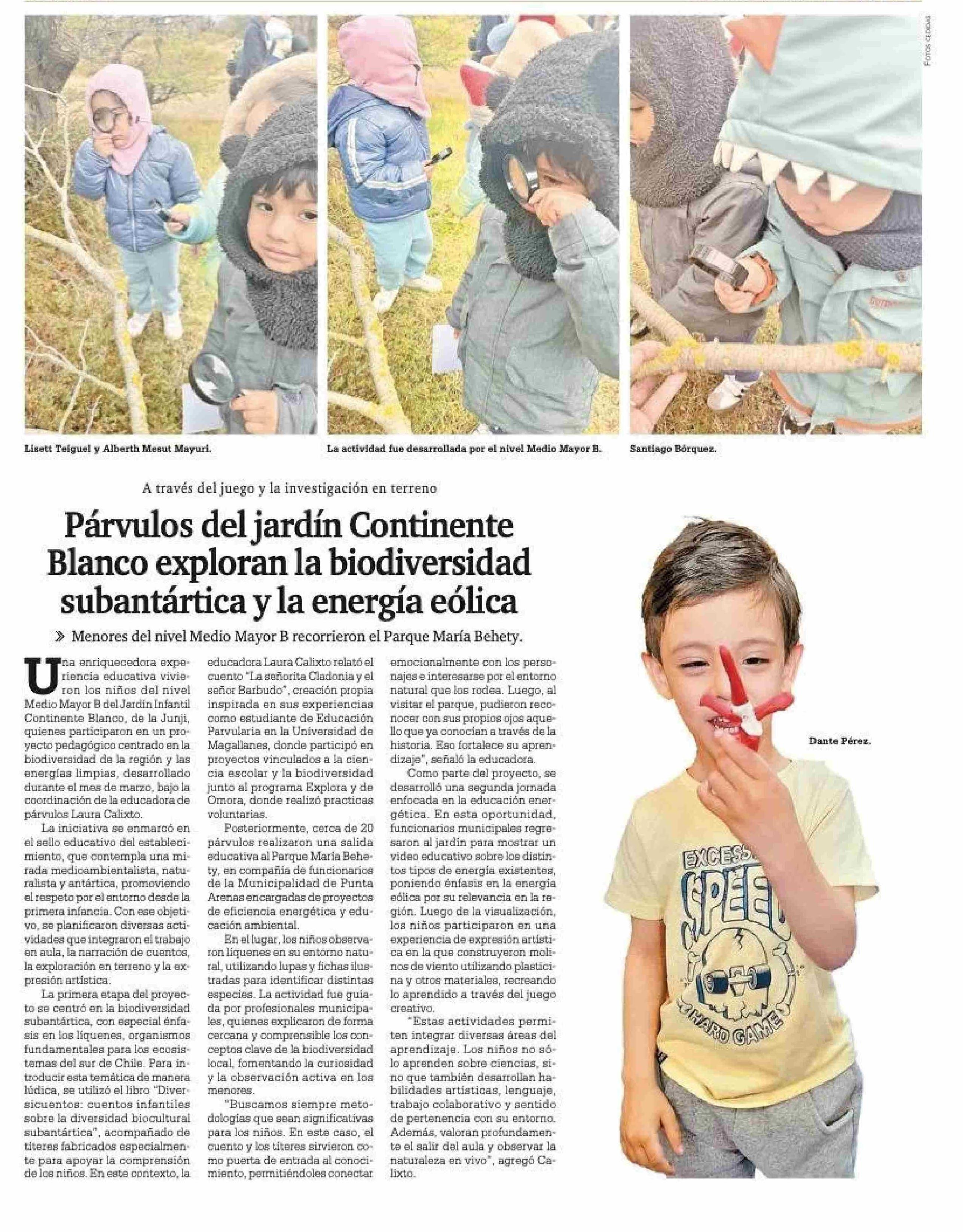 Título: Párvulos del jardín Continente Blanco exploran la biodiversidad subantártica y la energía eólica