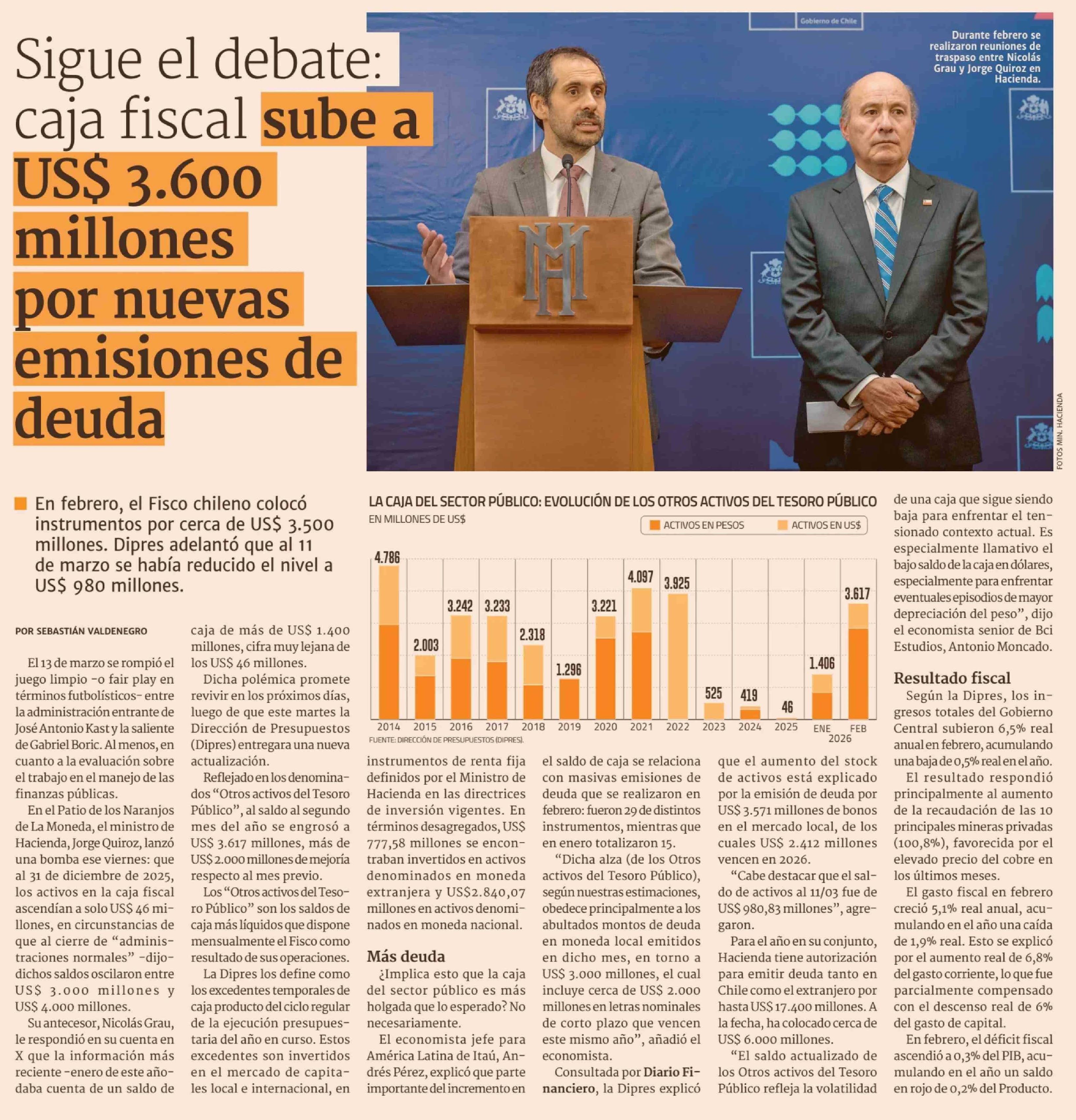 Sigue el debate: caja fiscal sube a US$ 3.600 millones por nuevas emisiones de deuda