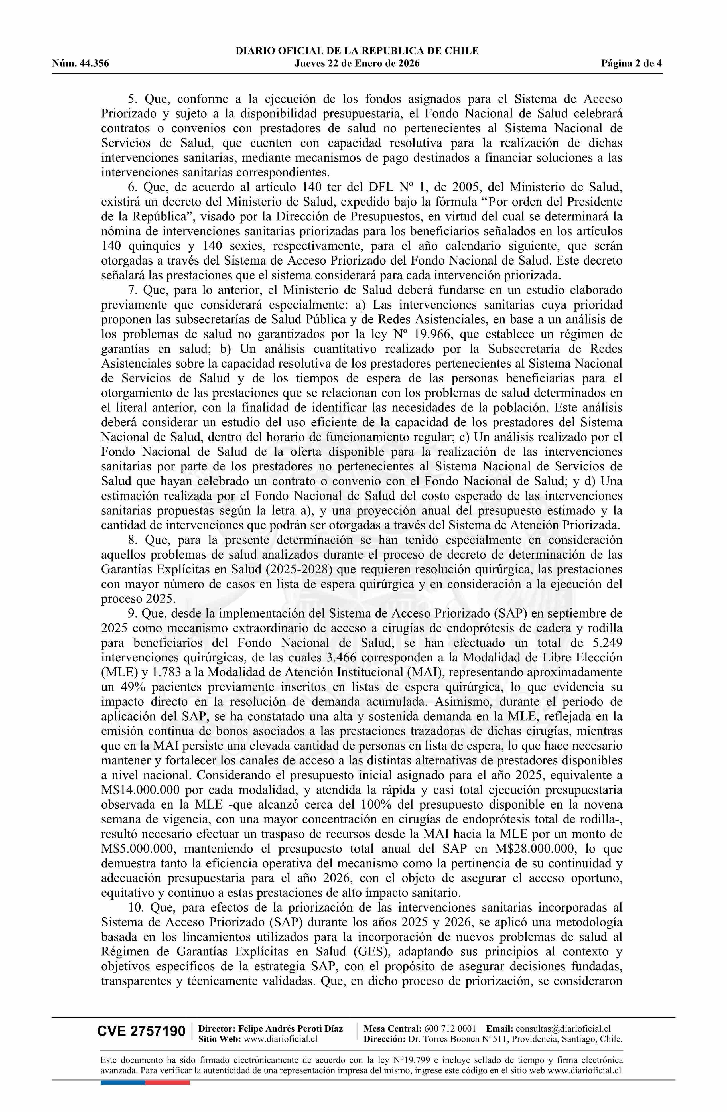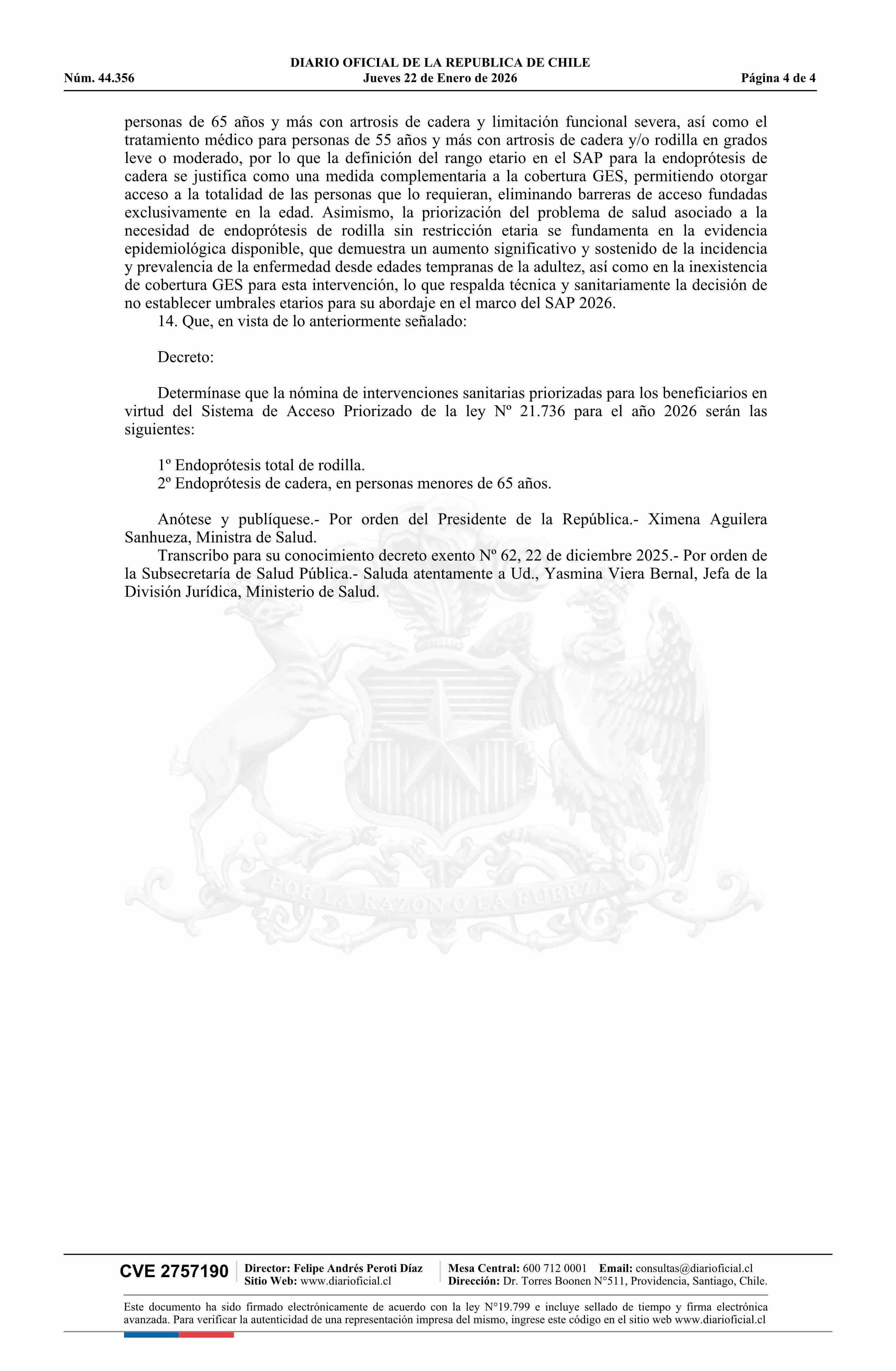 | Título: | Decreto exento número 62, de 2025.- Determina nómina de intervenciones sanitarias priorizadas otorgadas por sistema de acceso priorizado para el año 2026 conforme a la Ley Nº 21.736 |