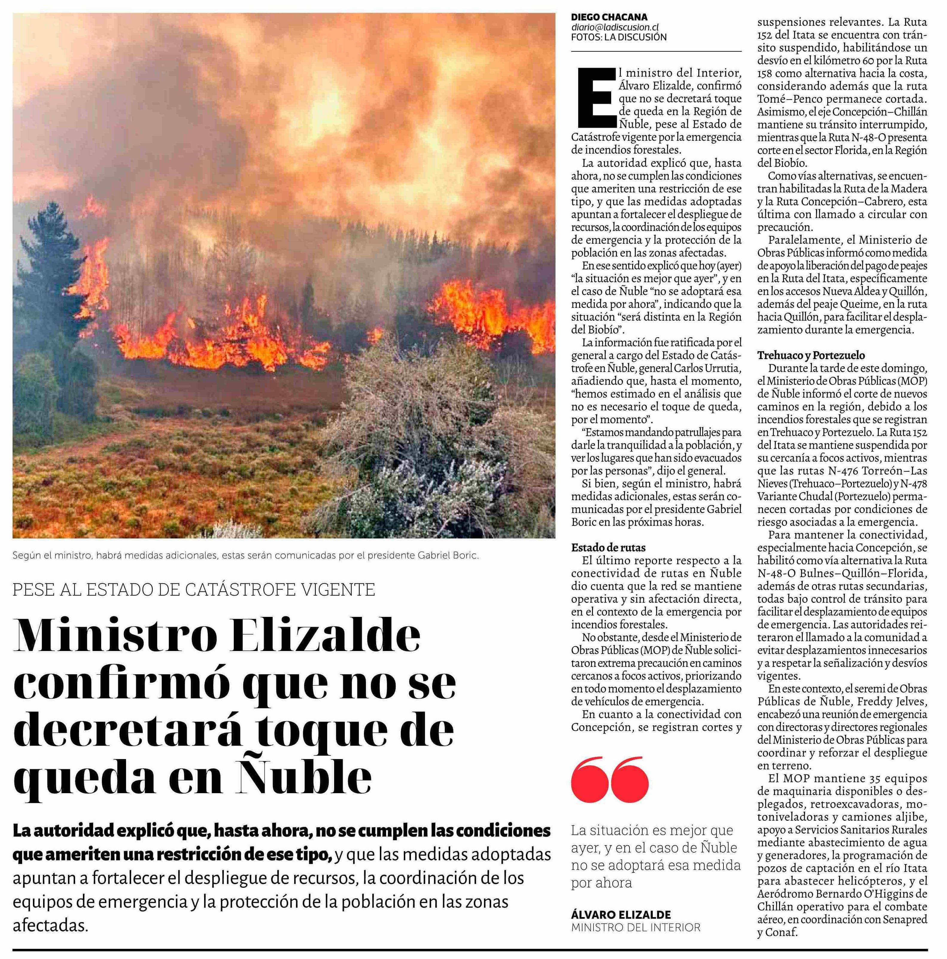 Ministro Elizalde confirmó que no se decretará toque de queda en Ñuble