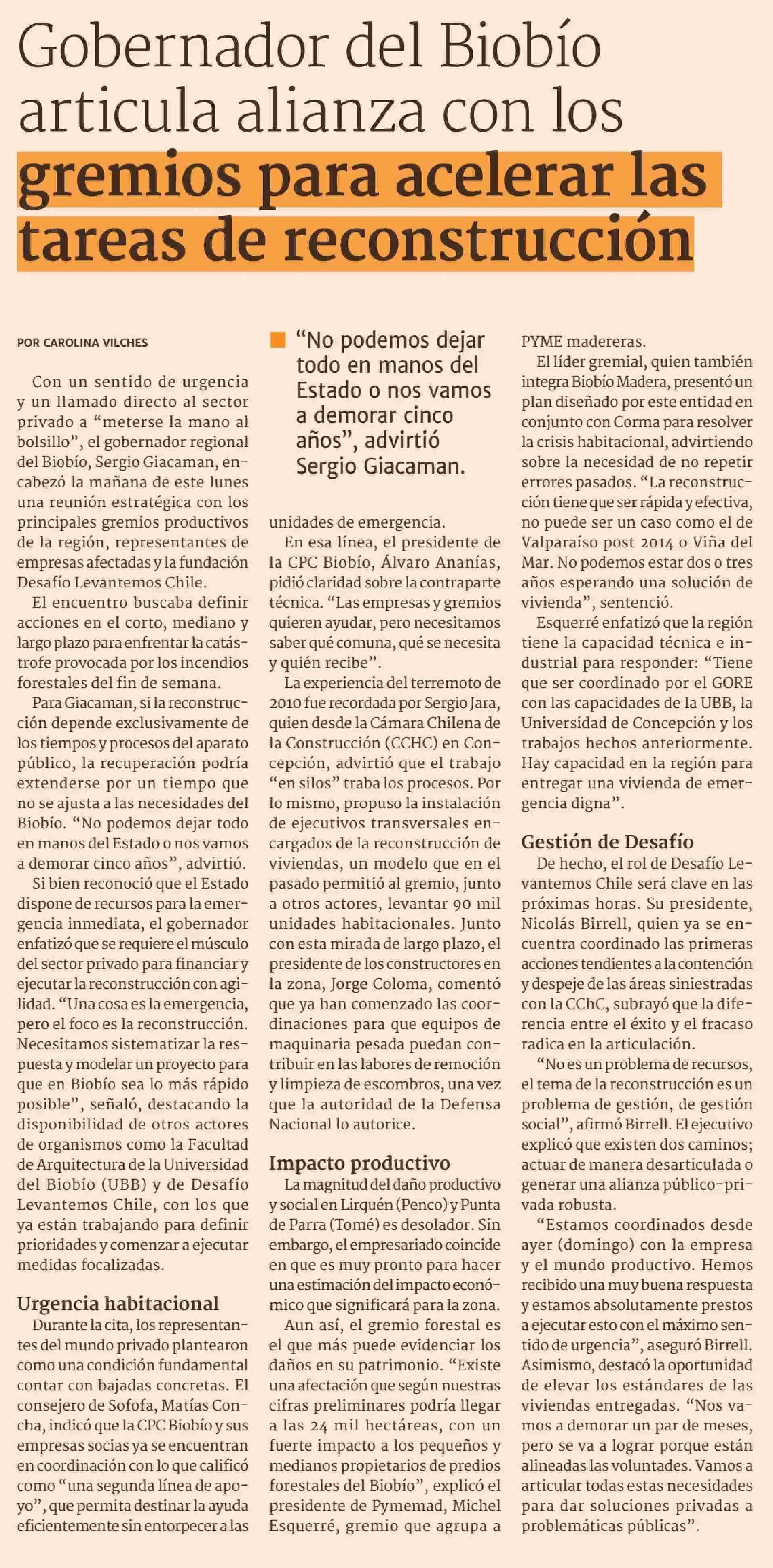 Gobernador del Biobío articula alianza con los gremios para acelerar las tareas de reconstrucción