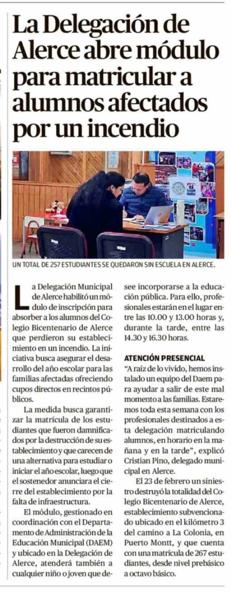 La Delegación de Alerce abre módulo para matricular a alumnos afectados por un incendio