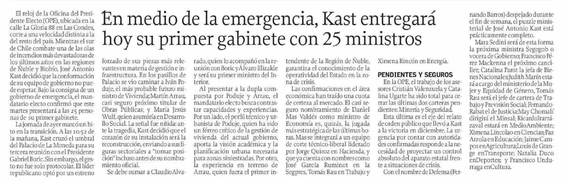 En medio de la emergencia, Kast entregará hoy su primer gabinete con 25 ministros