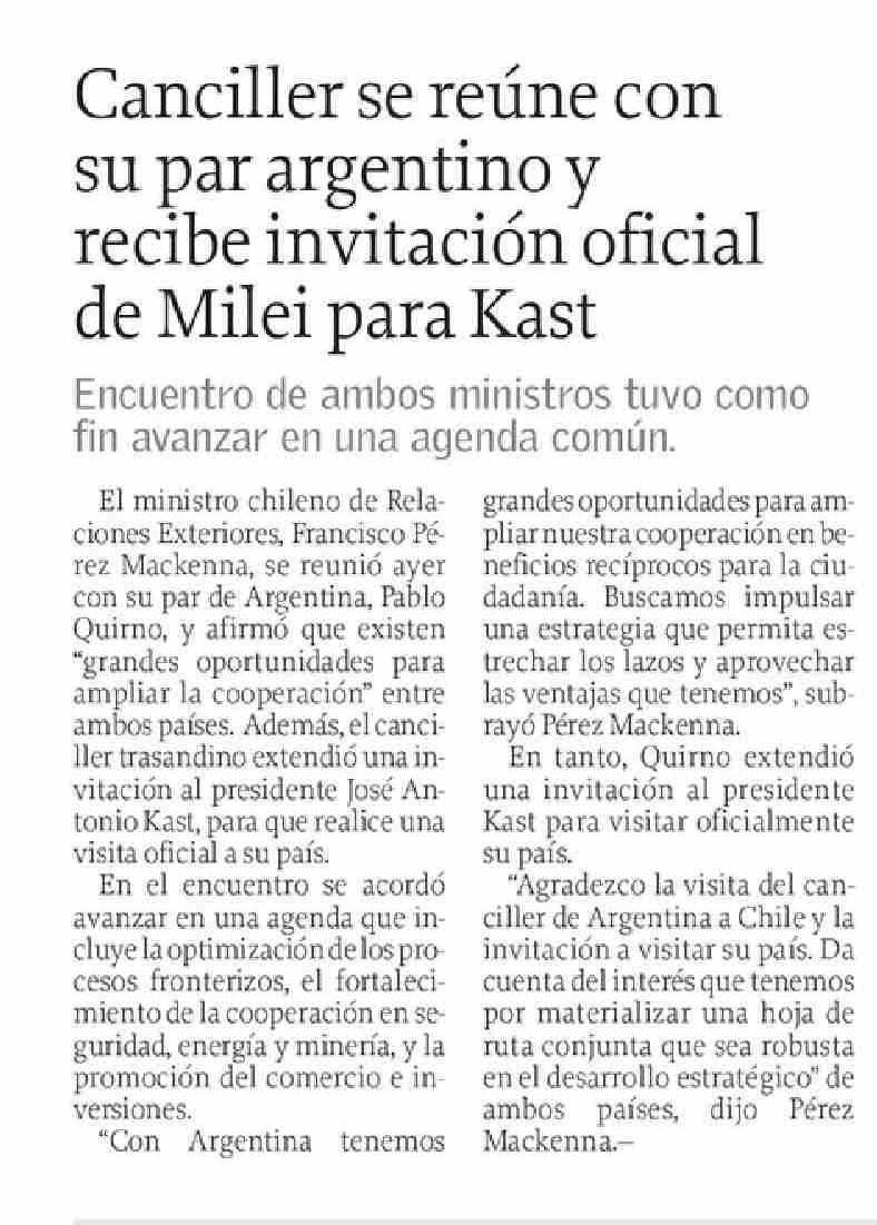 Canciller se reúne con su par argentino y recibe invitación oficial de Milei para Kast