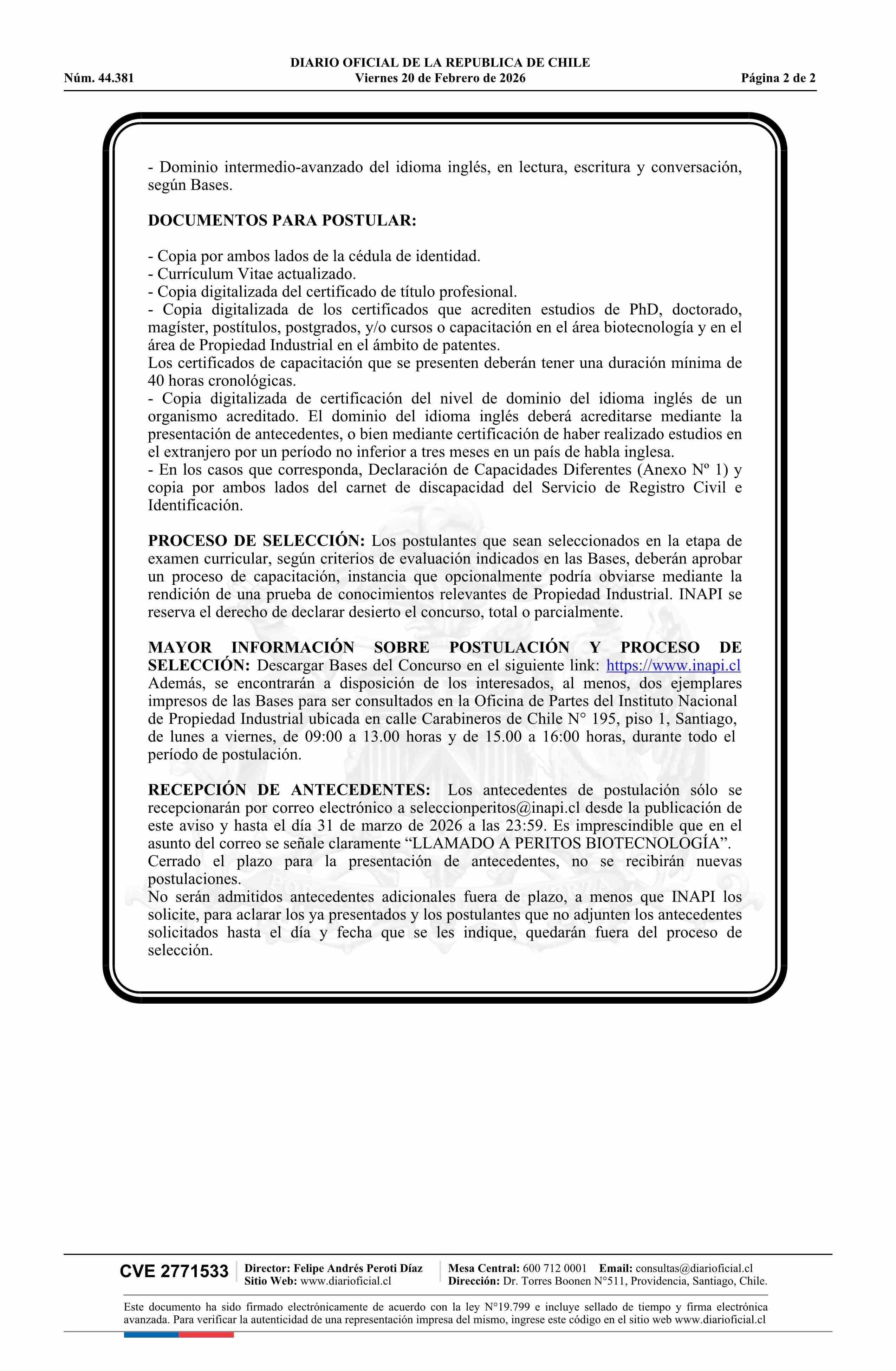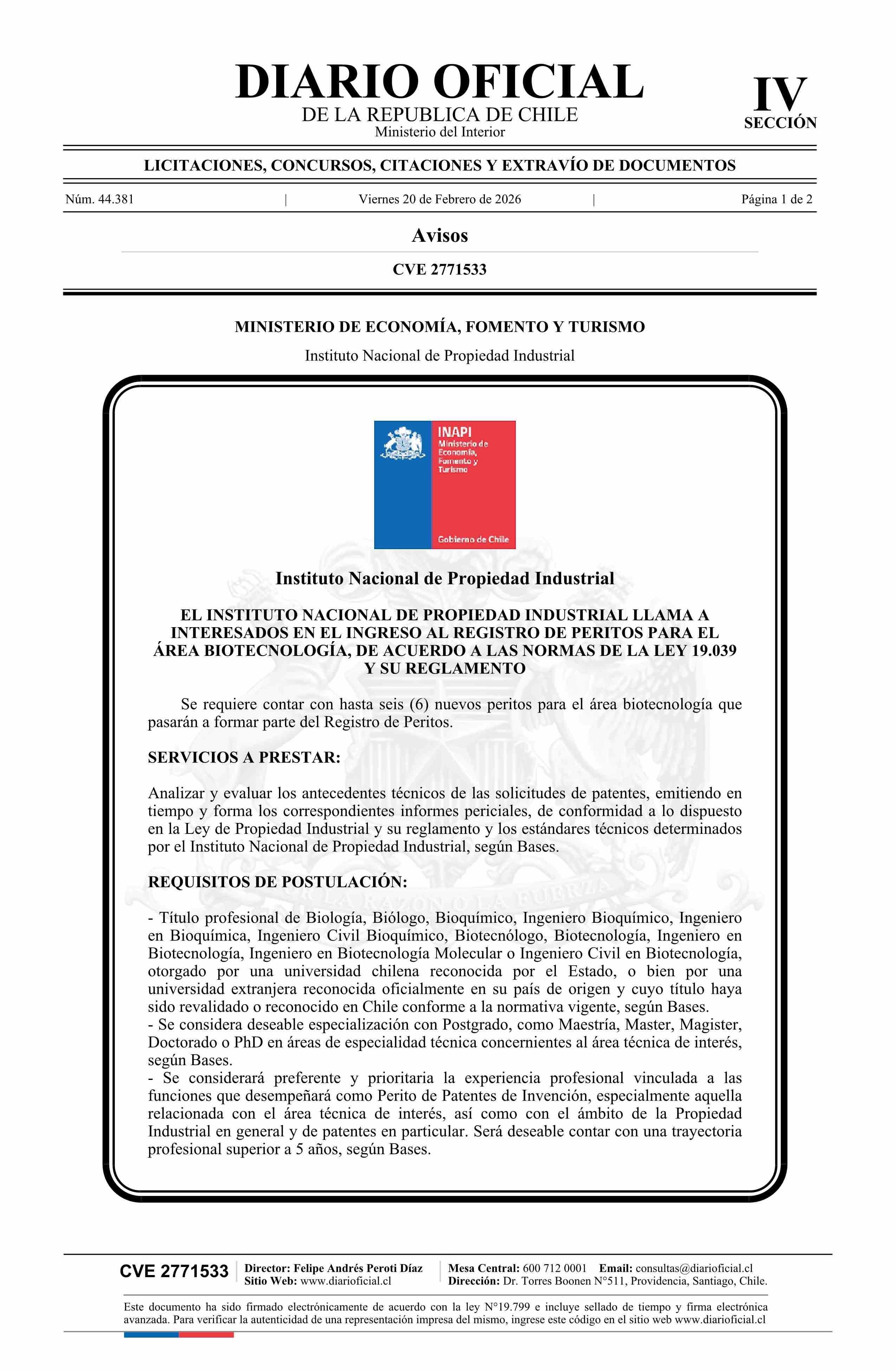 | Título: | AVISO LICITACIONES: Llama a concurso a interesados en el ingreso al Registro de Peritos para el área de Biotecnología |
