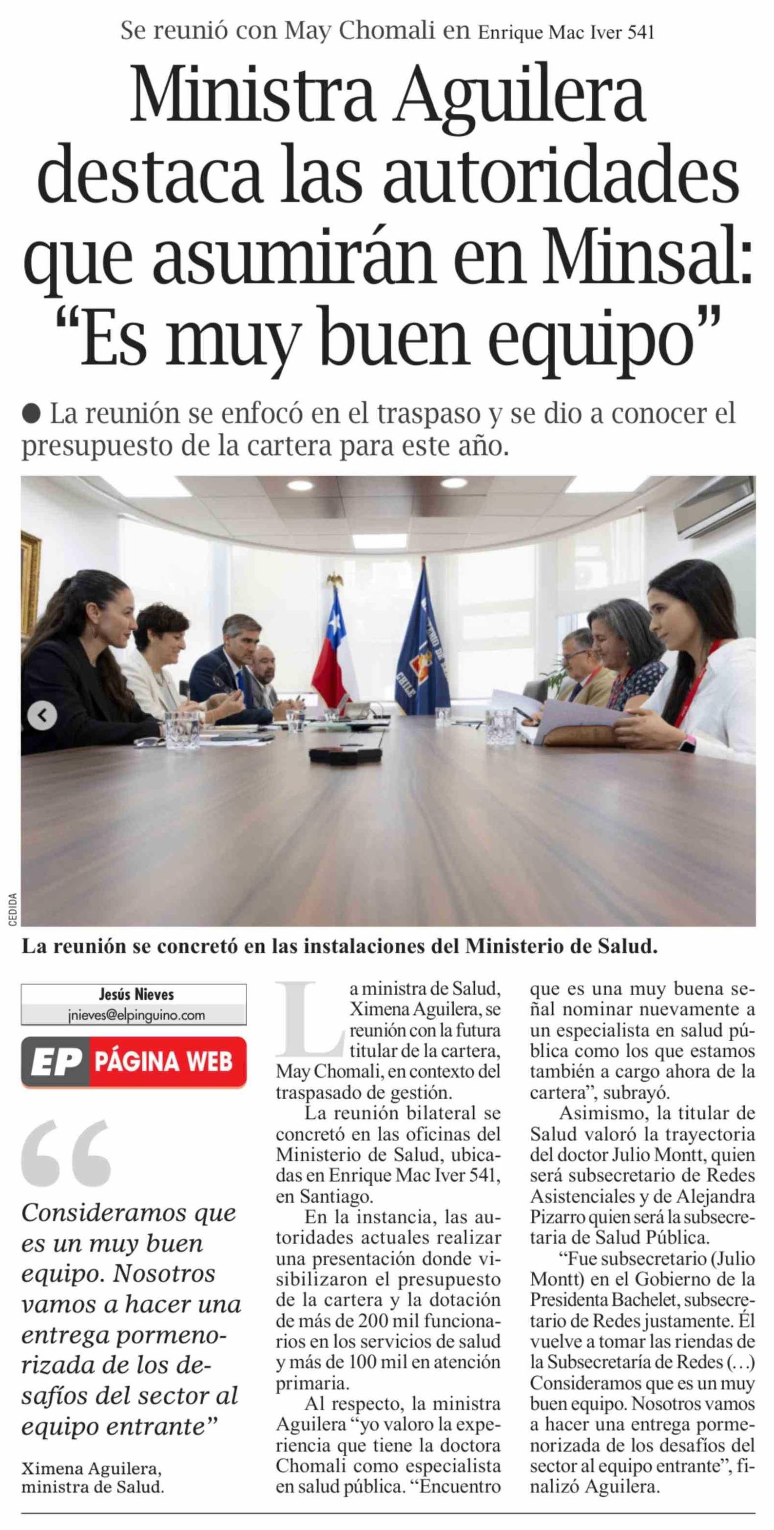 Título: Ministra Aguilera destaca las autoridades que asumirán en Minsal: "Es muy buen equipo"