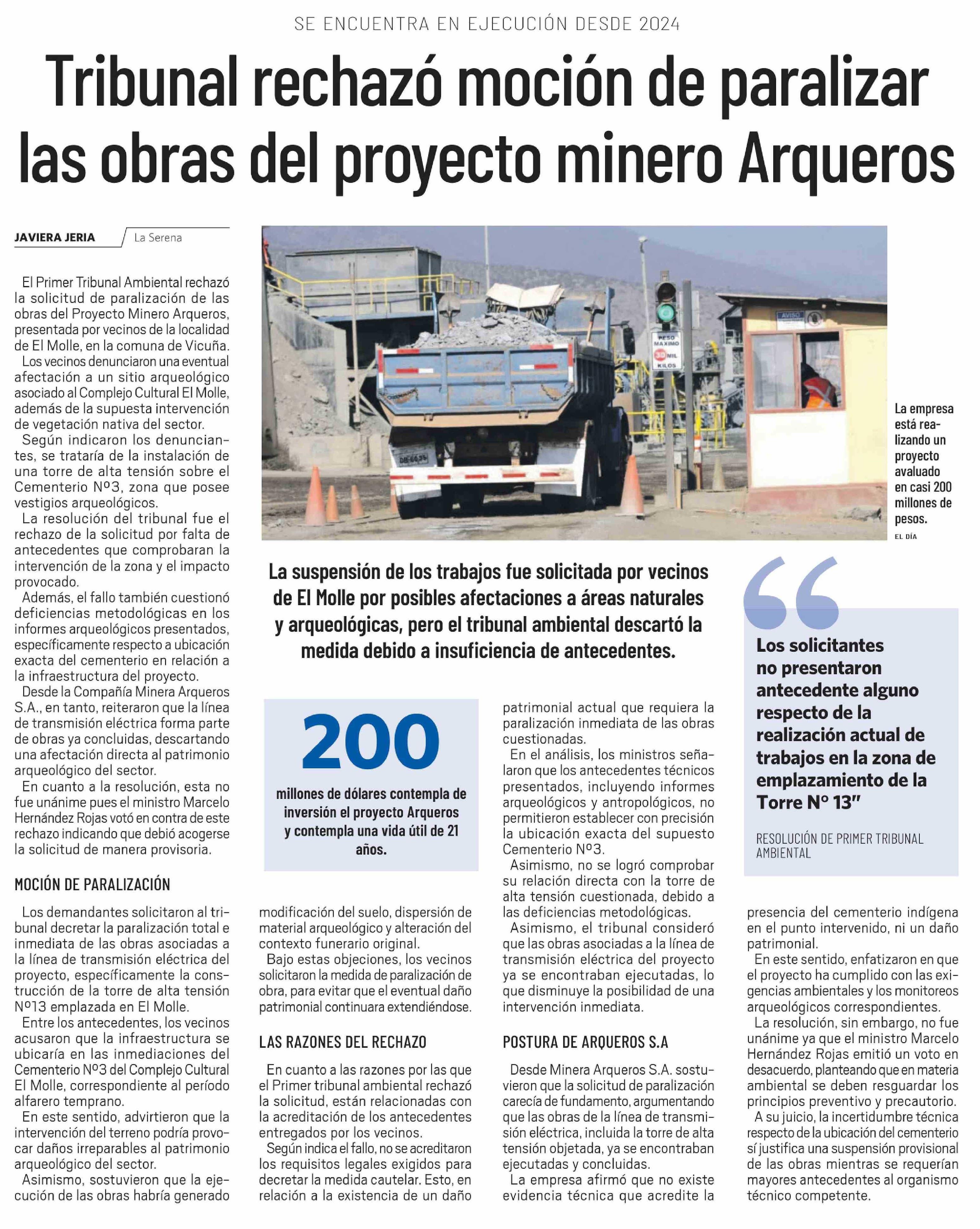 Tribunal rechazó moción de paralizar las obras del proyecto minero Arqueros
