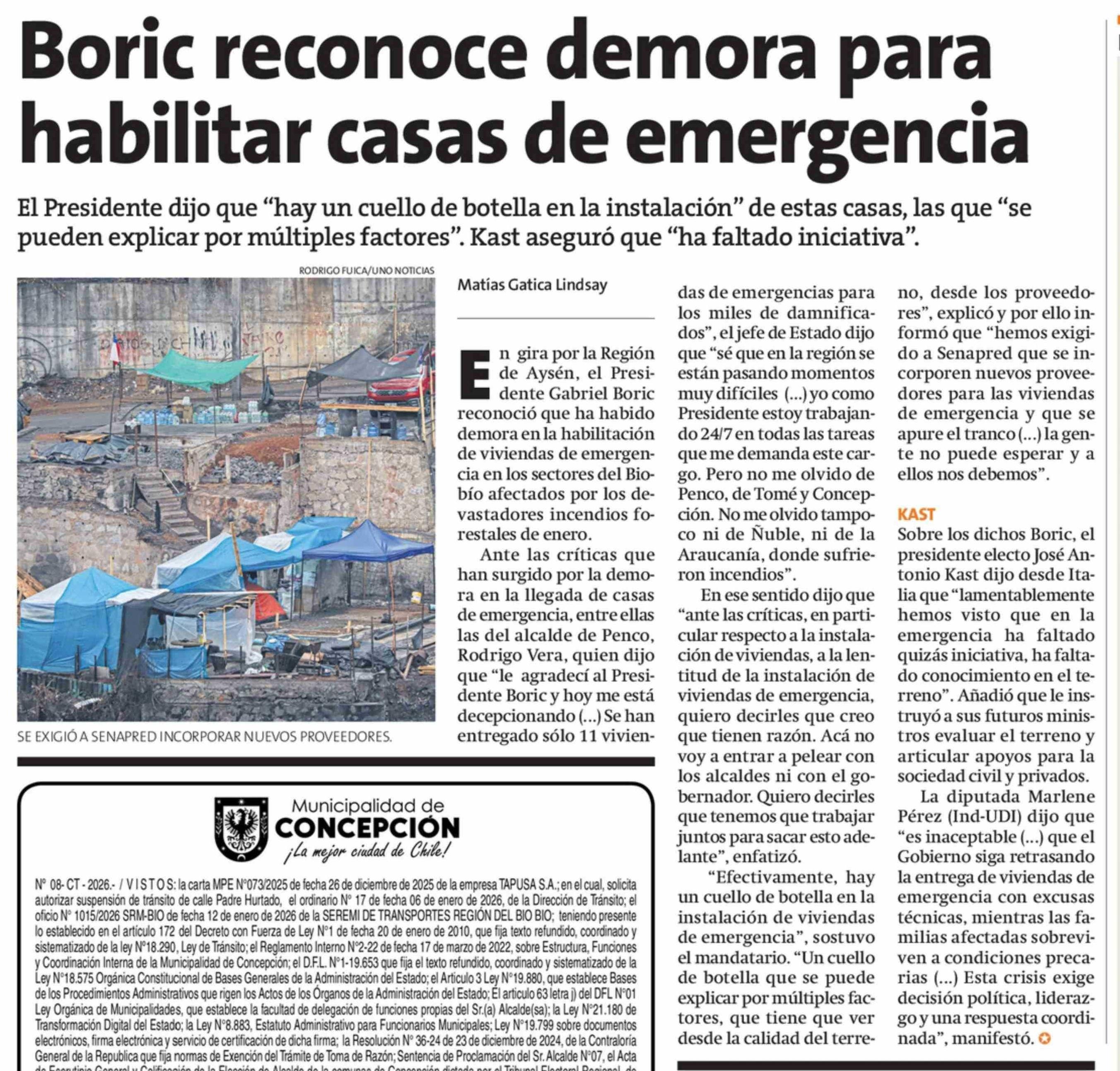 Boric reconoce demora para habilitar casas de emergencia