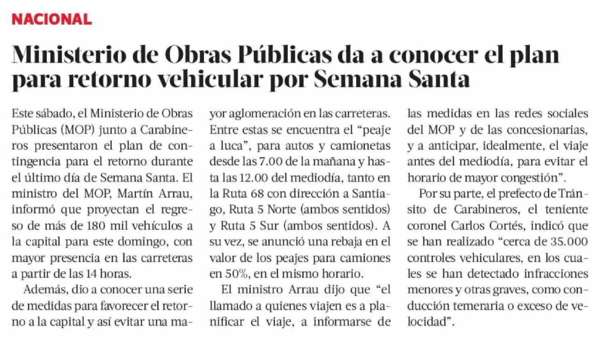 Ministerio de Obras Públicas da a conocer el plan para retorno vehicular por Semana Santa