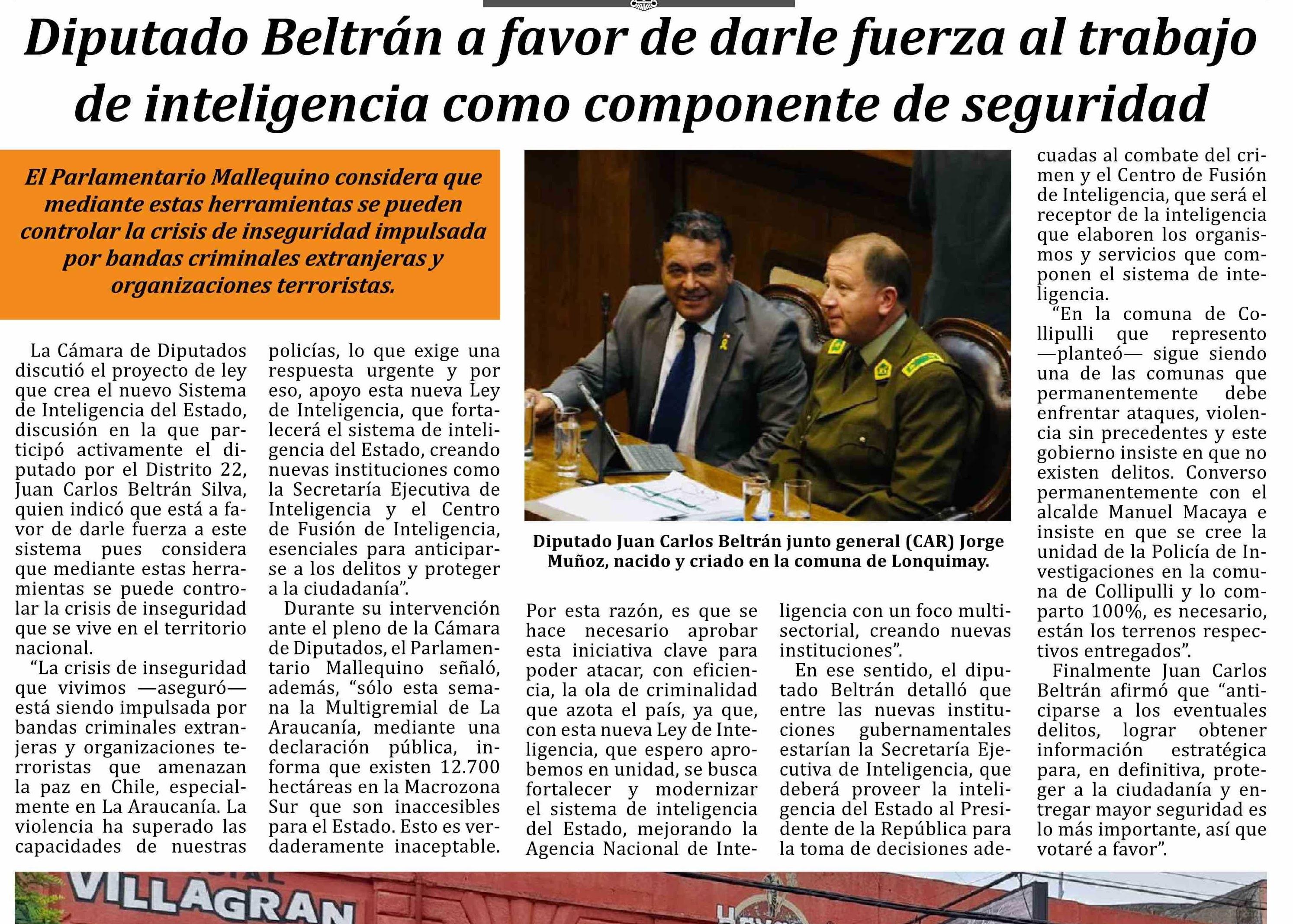 Diputado Beltrán a favor de darle fuerza al trabajo de inteligencia como componente de seguridad