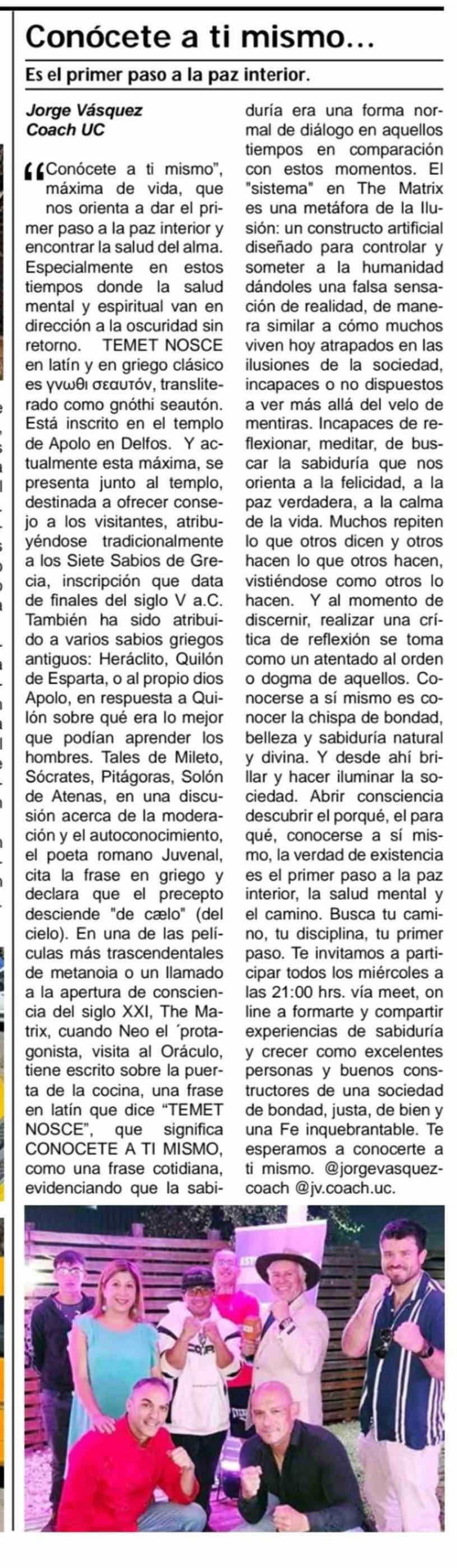 Título: " (Conocete a ti mismo", máxima de vida, que nos orienta a dar el primer paso a la paz interior y encontrar la salud del alma. Especialmente en estos tiempos donde la salud mental y espiritual van en dirección a la oscuridad sin retorno. TEMET NOSCE en latín y en griego clásico es ????? sea?t??, tra