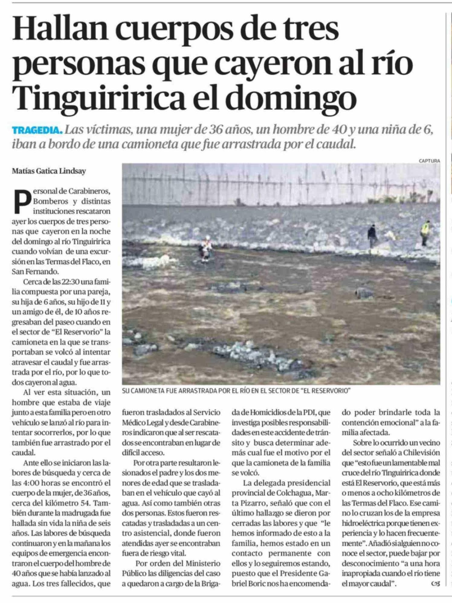 Hallan cuerpos de tres personas que cayeron al río Tinguiririca el domingo