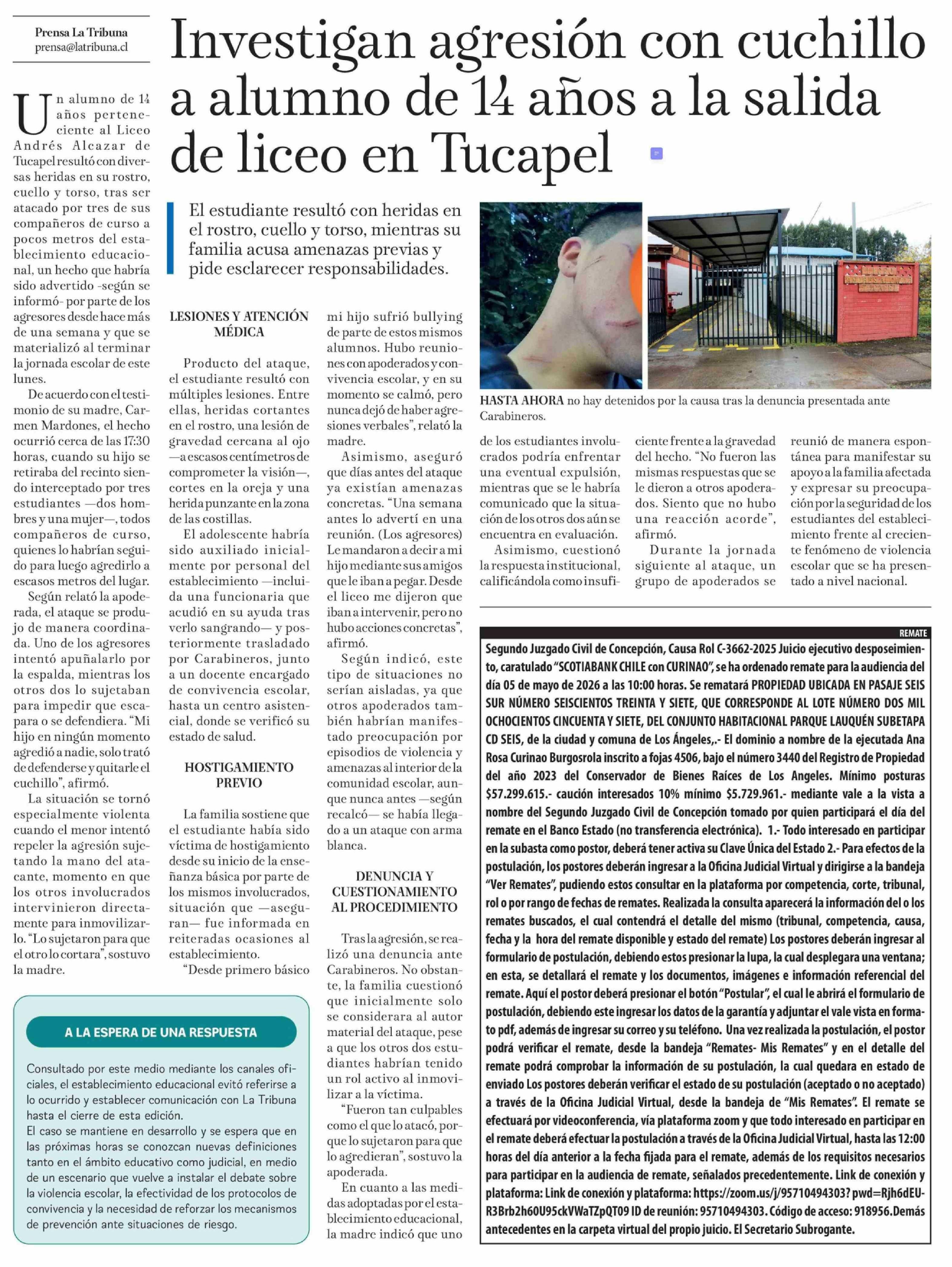 Investigan agresión con cuchillo a alumno de 14 años a la salida de liceo en Tucapel
