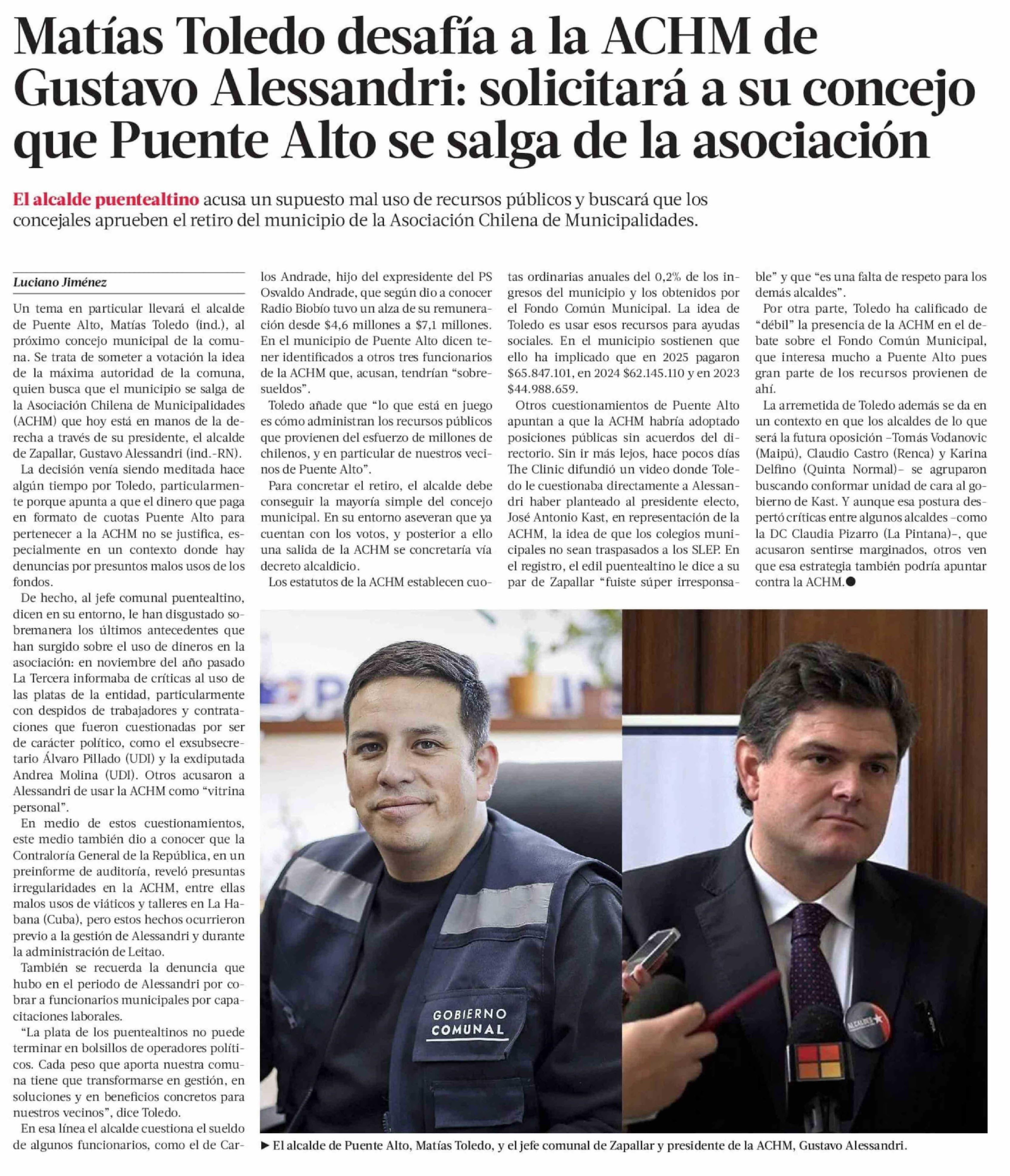 Matías Toledo desafía a la ACHM de Gustavo Alessandri: solicitará a su concejo que Puente Alto se salga de la asociación