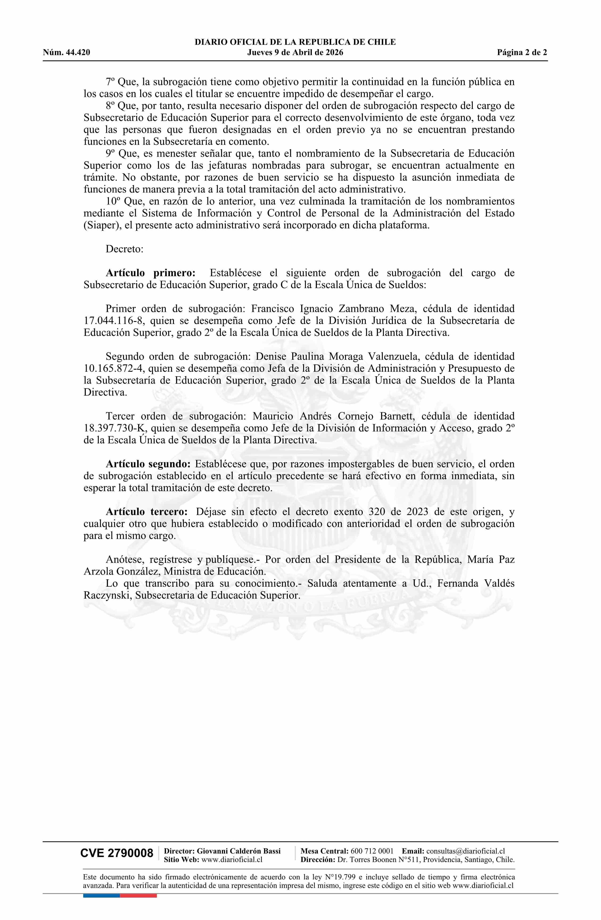 | Título: | Decreto exento número 222, de 2026.- Establece orden de subrogación del cargo de Subsecretario de Educación Superior y deja sin efecto decreto 320 exento, de 2023 |