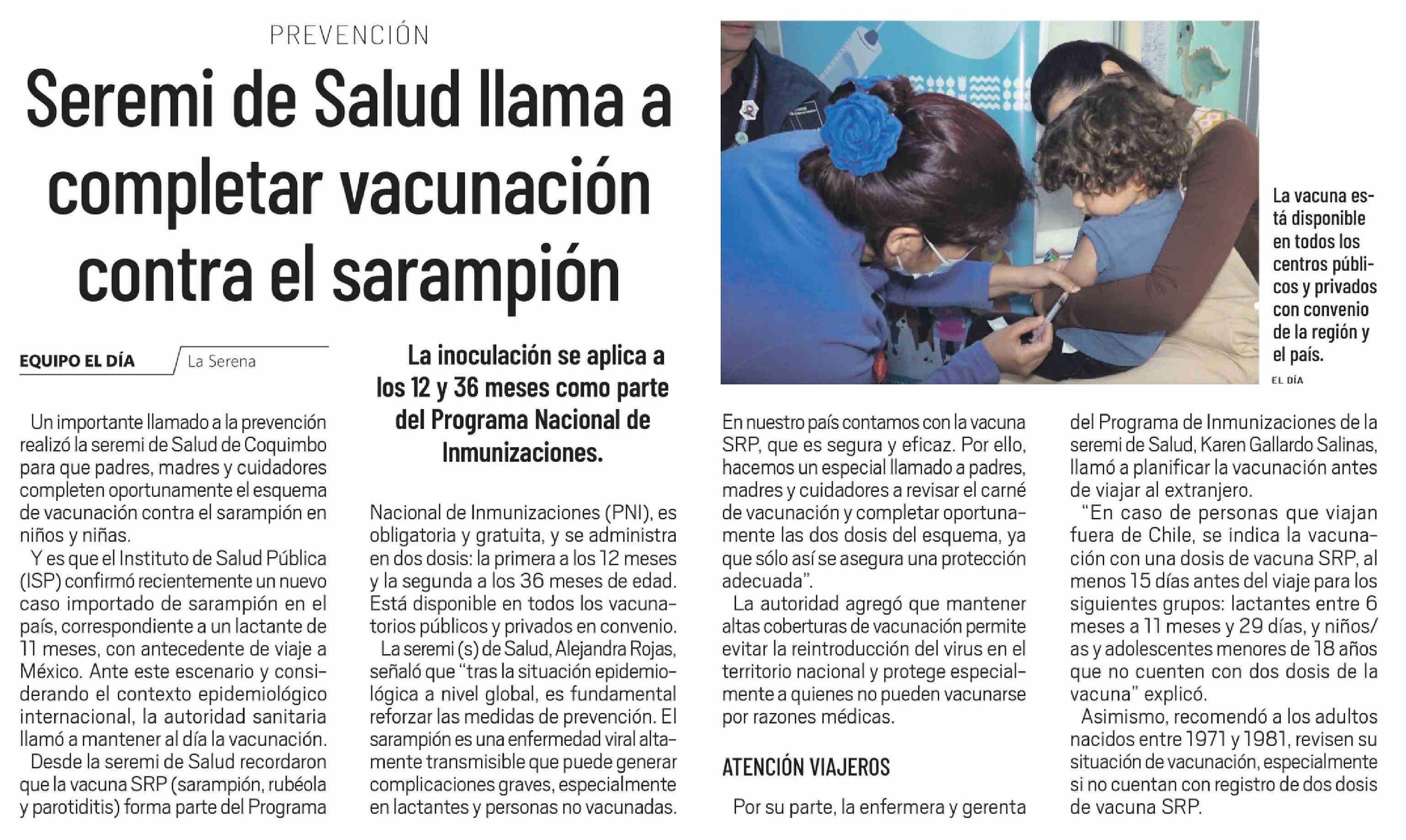 Seremi de Salud llama a completar vacunación contra el sarampión