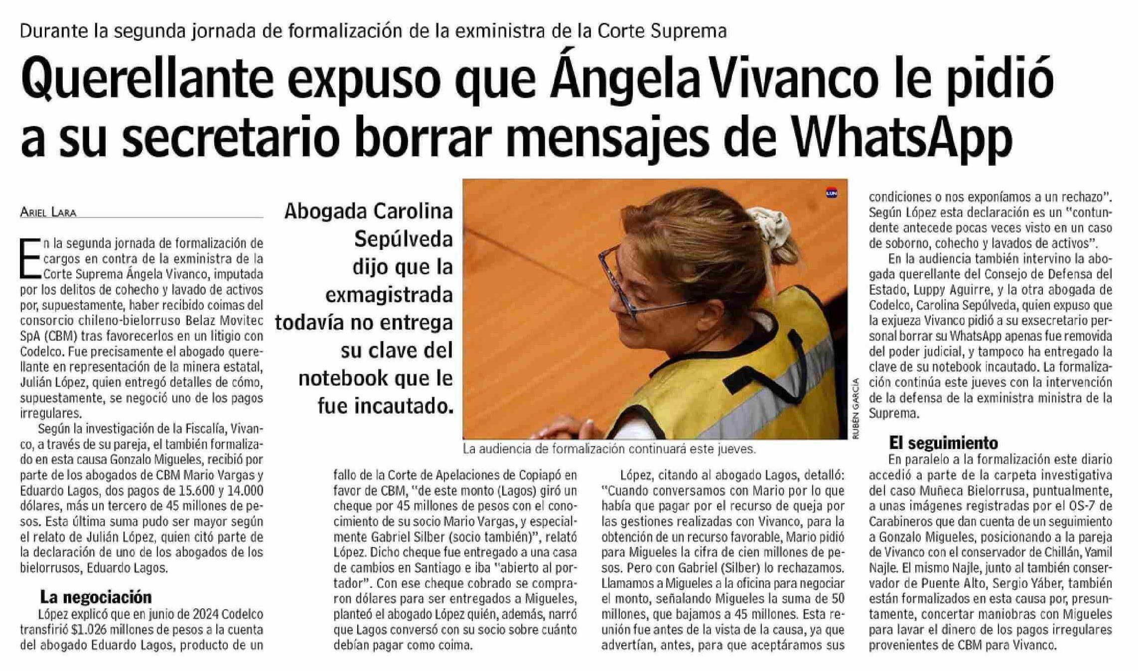 Querellante expuso que Angela Vivanco le pidió a su secretario borrar mensajes de WhatsApp