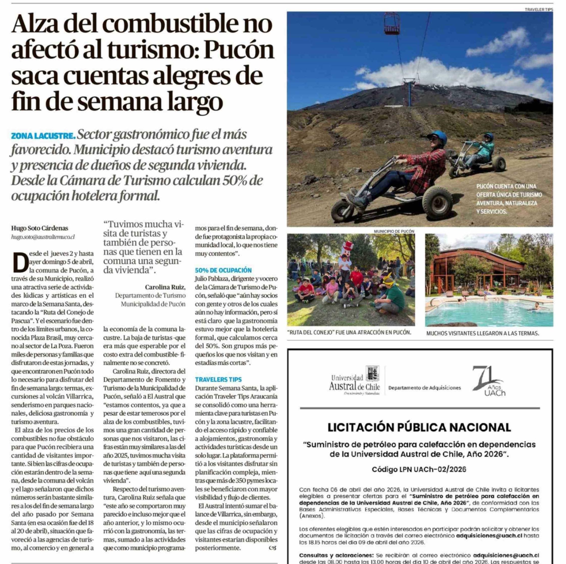 Alza del combustible no afectó al turismo: Pucón saca cuentas alegres de fin de semana largo