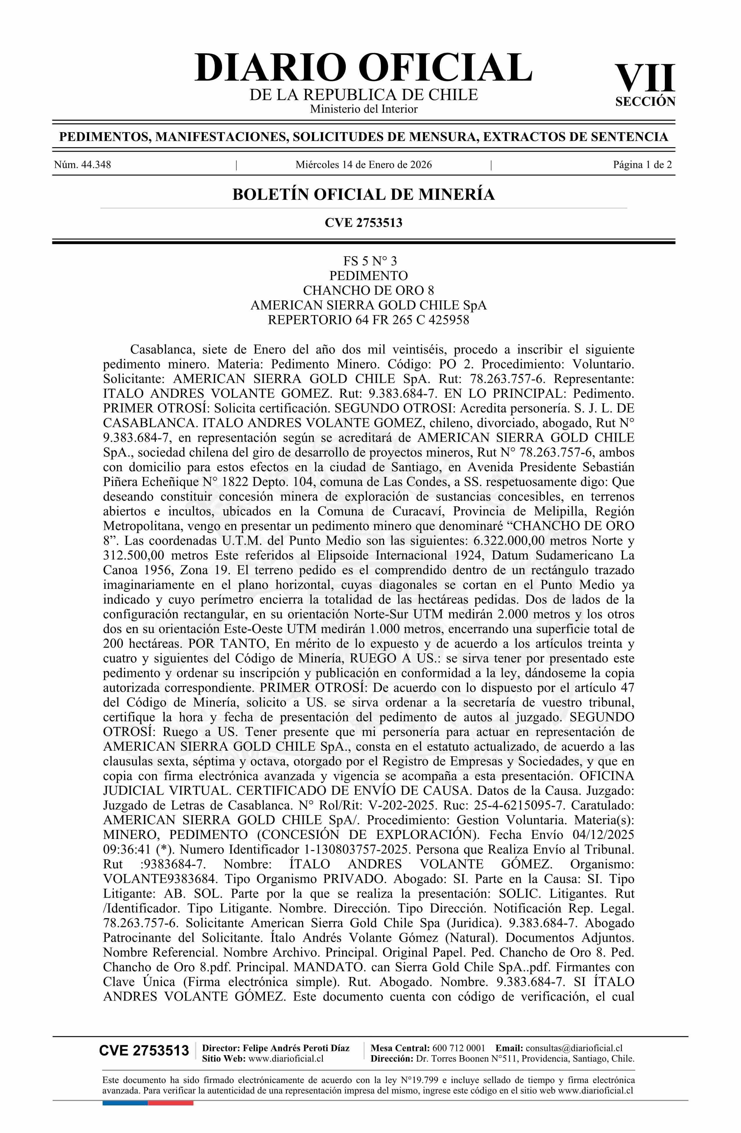 DIARIO OFICIAL CHILE - BOLETÍN OFICIAL DE MINERÍA (DIARIO OFICIAL CHILE – BOM – PEDIMENTOS MINEROS)