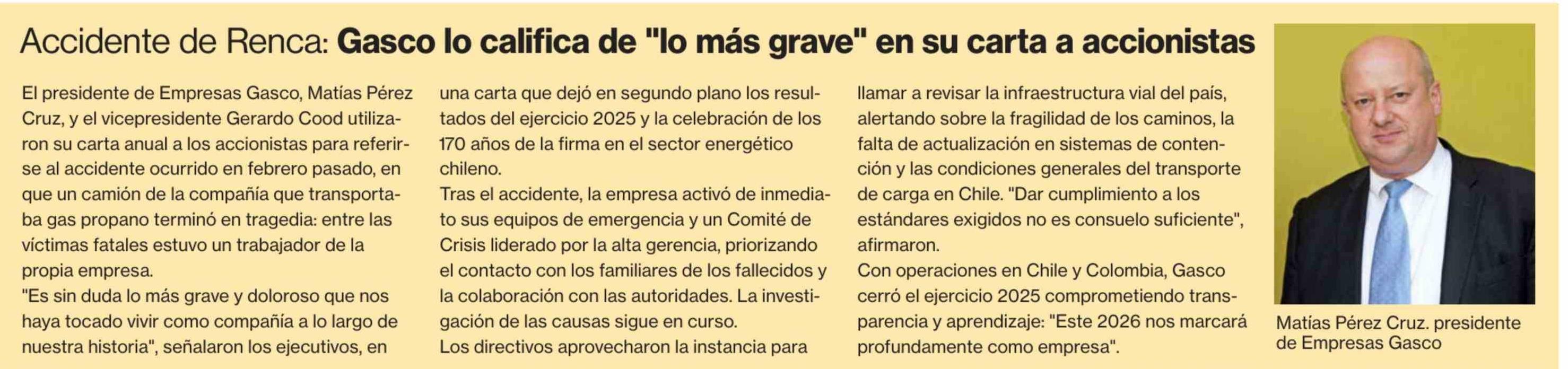 Accidente de Renca: Gasco lo califica de "lo más grave" en su carta a accionistas