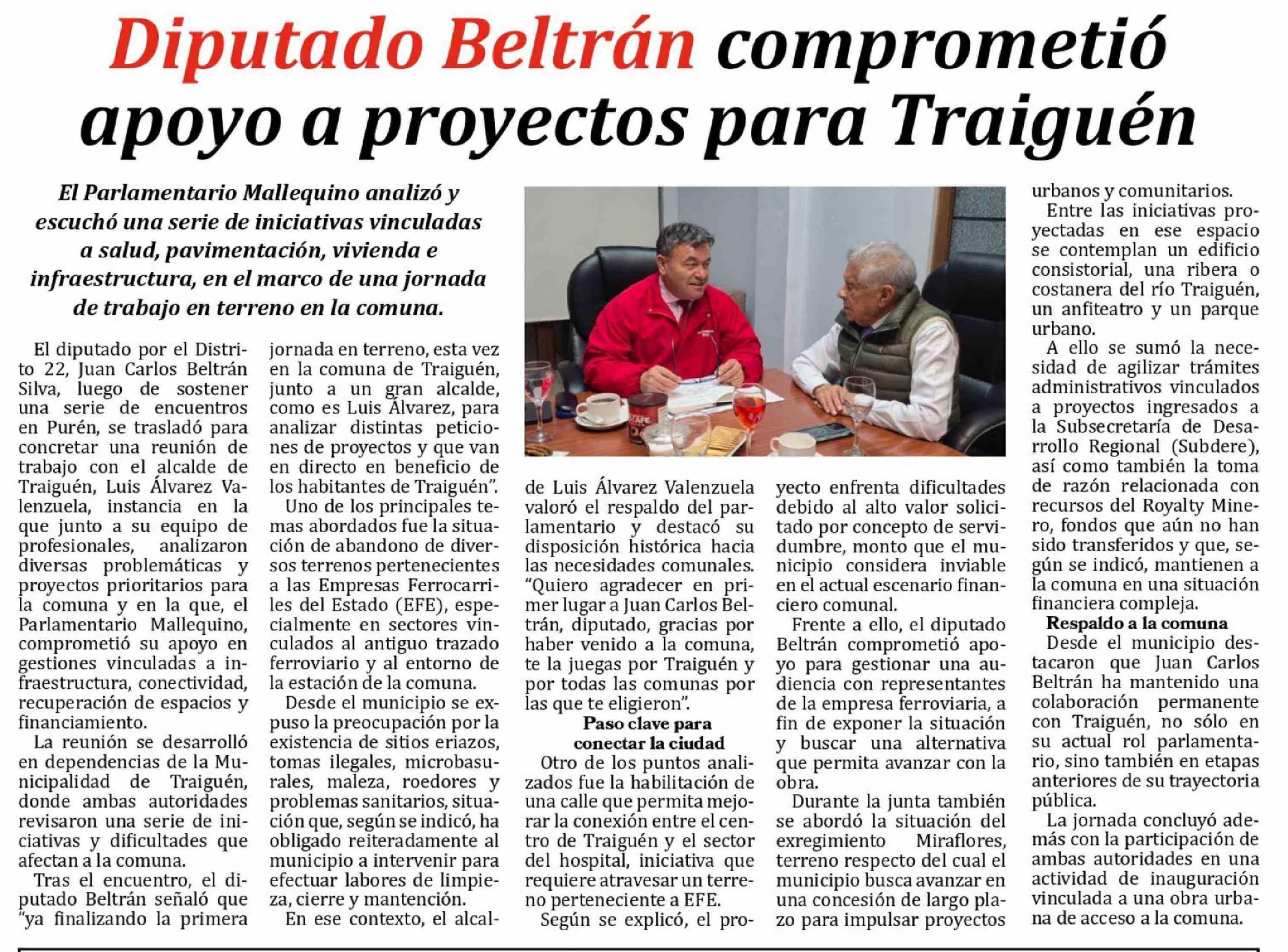 Diputado Beltrán comprometió apoyo a proyectos para Traiguén