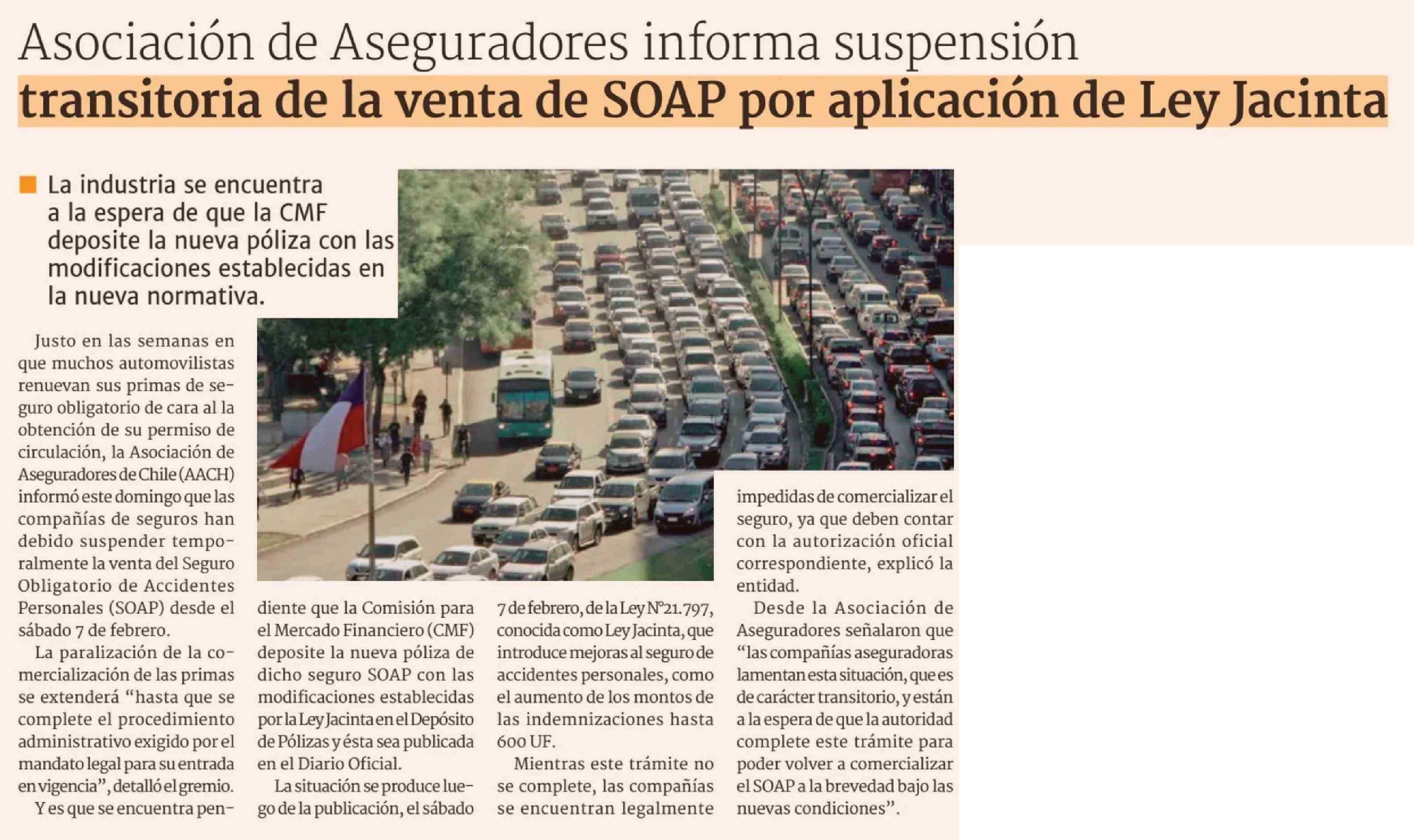 Asociación de Aseguradores informa suspensión transitoria de la venta de SOAP por aplicación de Ley Jacinta