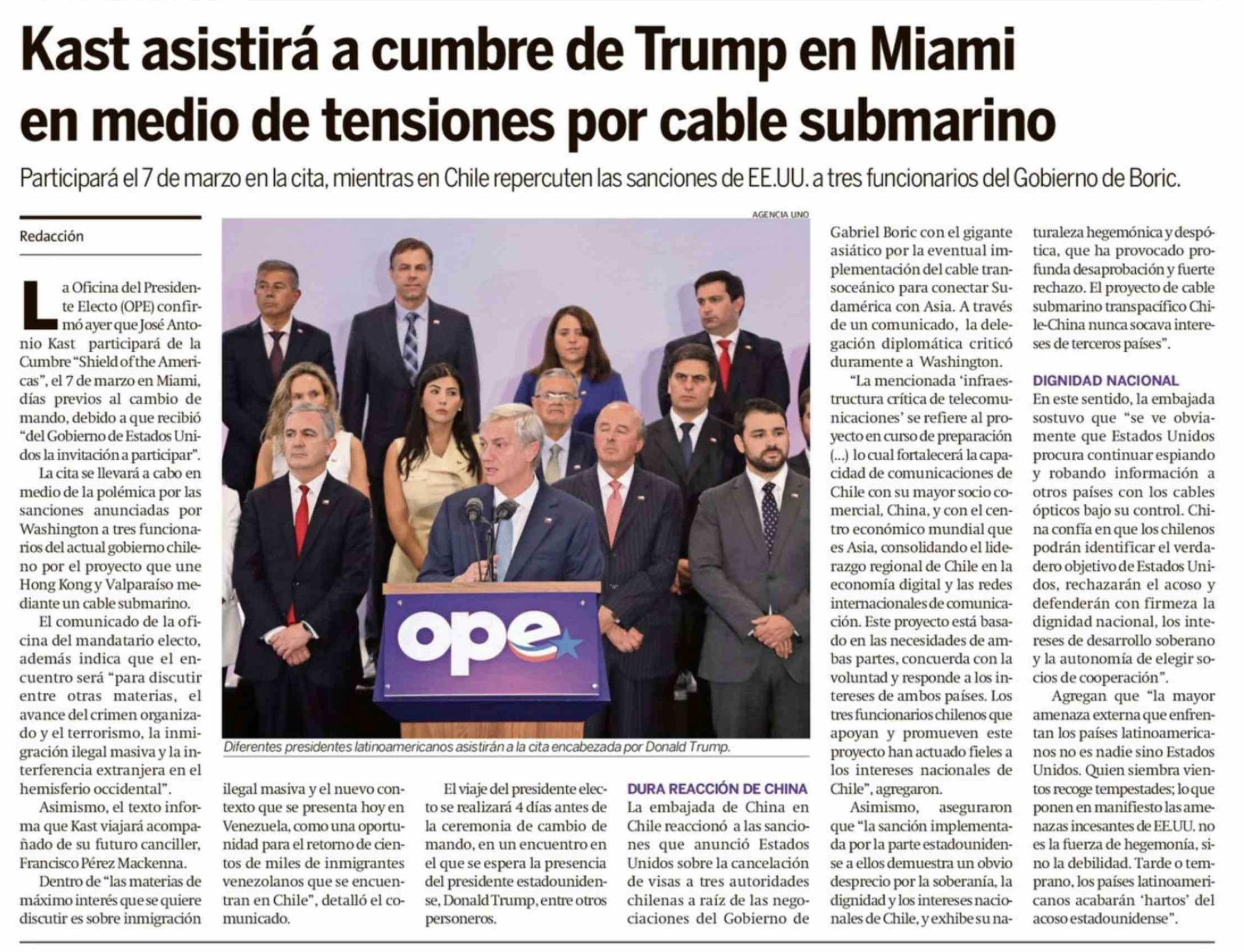 Kast asistirá a cumbre de Trump en Miami en medio de tensiones por cable submarino