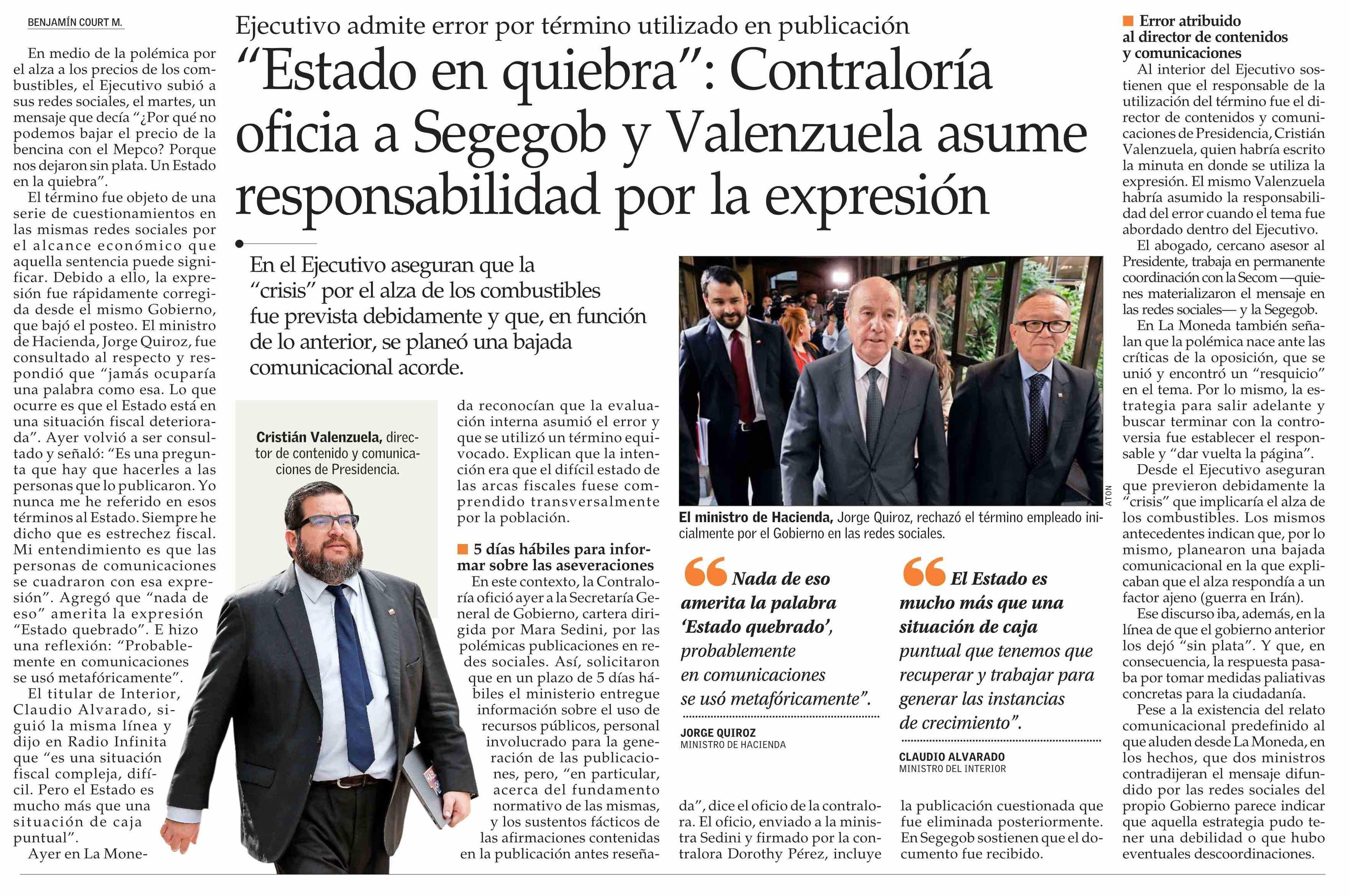 “Estado en quiebra”: Contraloría oficia a Segegob y Valenzuela asume responsabilidad por la expresión