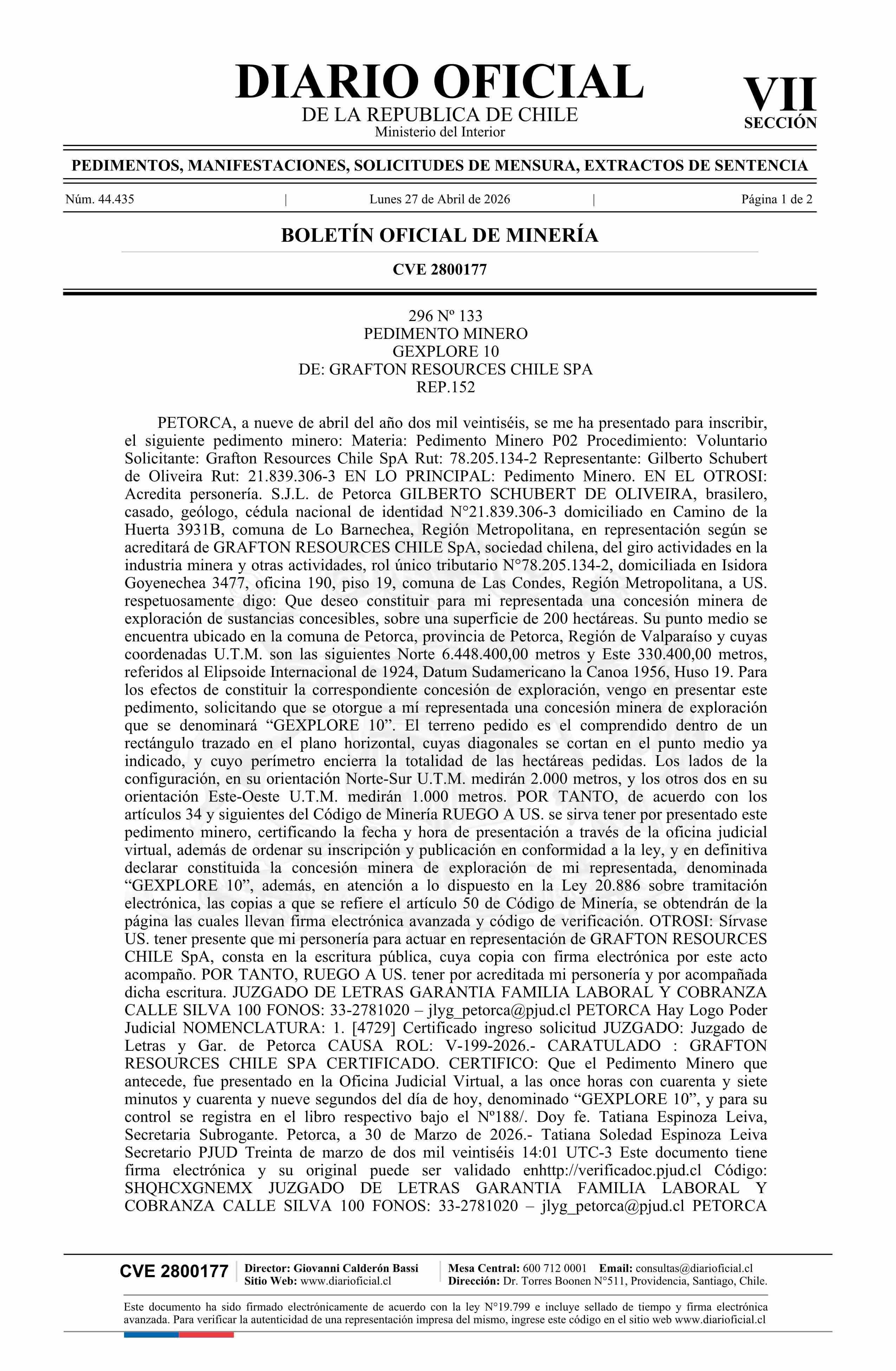 GEXPLORE 10 / Grafton Resources Chile SpA