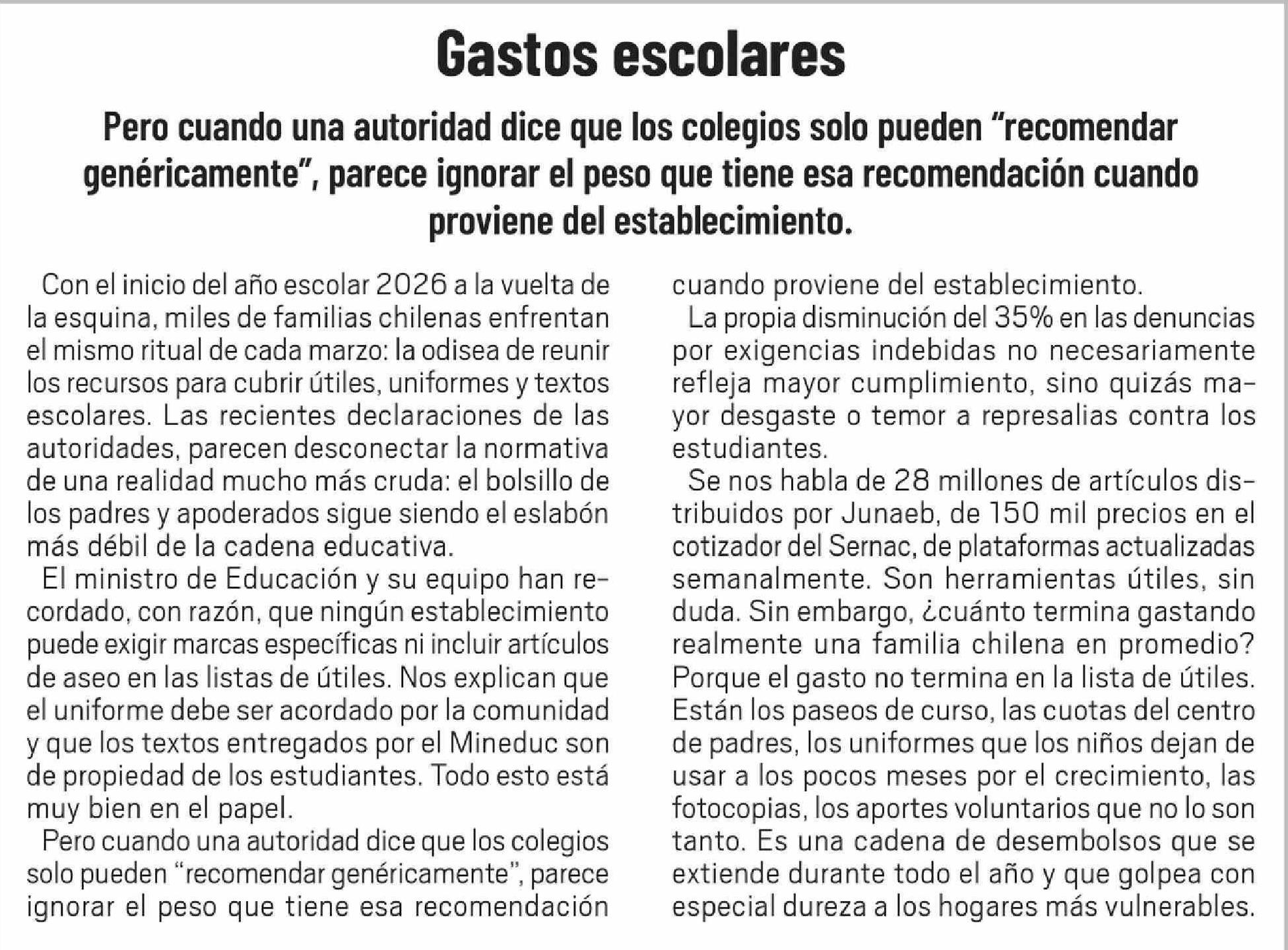 Título: Editorial: Con el inicio del año escolar 2026 a la vuelta de la esquina, miles de familias chilenas enfrentan el mismo ritual de cada marzo: la odisea de reunir los recursos para cubrir útiles, uniformes y textos escolares. Las recientes declaraciones de las autoridades, parecen desconectar la norma
