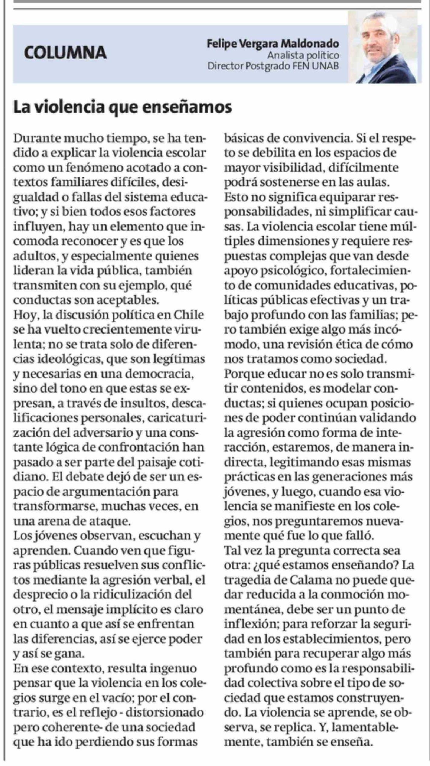 | Título: | Columnas de Opinión: Durante mucho tiempo, se ha tendido a explicar la violencia escolar como un fenómeno acotado a contextos familiares difíciles, desigualdad o fallas del sistema educativo; y si bien todos esos factores influyen, hay un elemento que incomoda reconocer y es que los adultos, y espec |