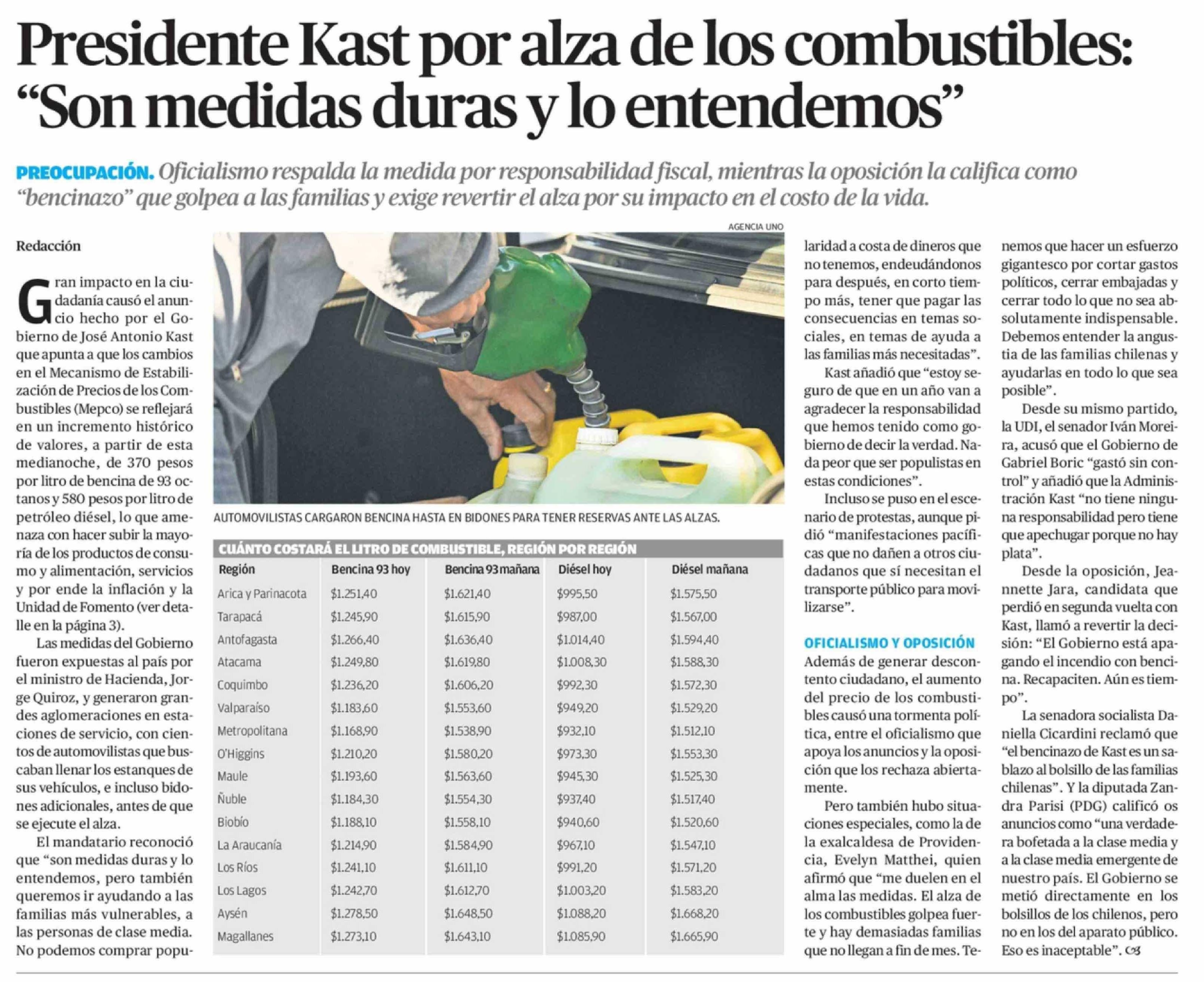 Presidente Kast por alza de los combustibles: "Son medidas duras y lo entendemos"