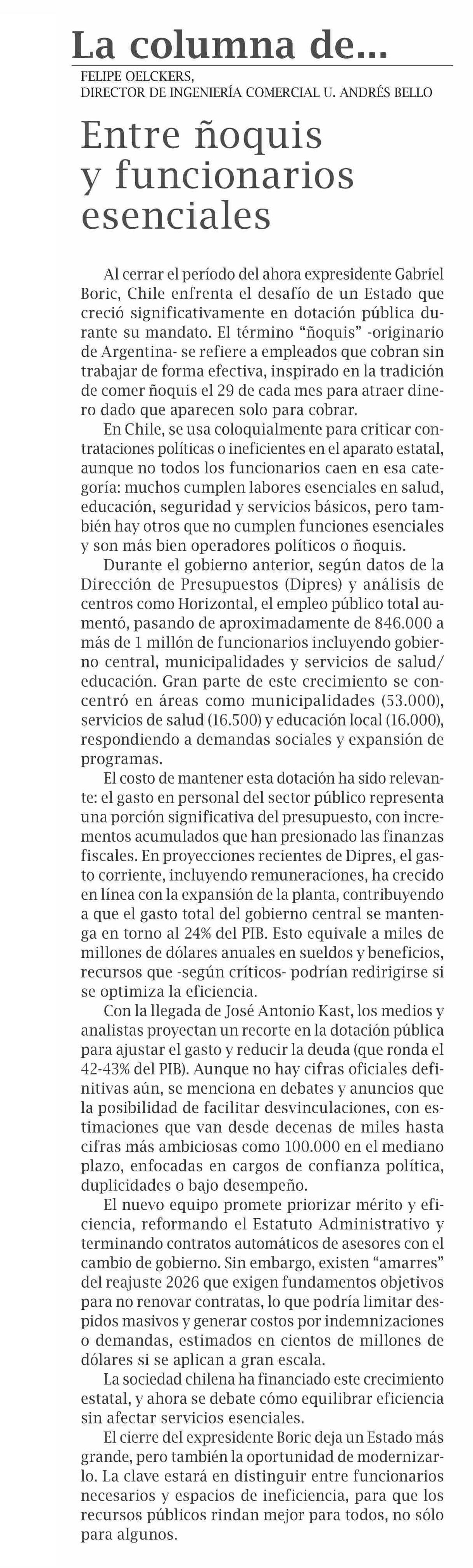 COLUMNAS DE OPINIÓN: DIRECTOR DE INGENIERIA COMERCIAL U. ANDRES BELLO Entre ñoquis y funcionarios esenciales